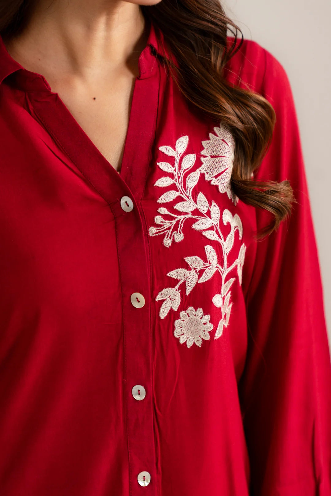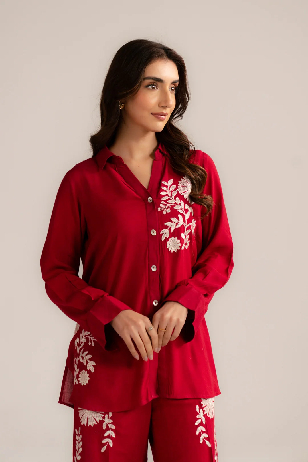 - Tangerine Khaddar Shirt: Orange khaddar top with embroidered botanical patterns. Fabric: Khaddar.
