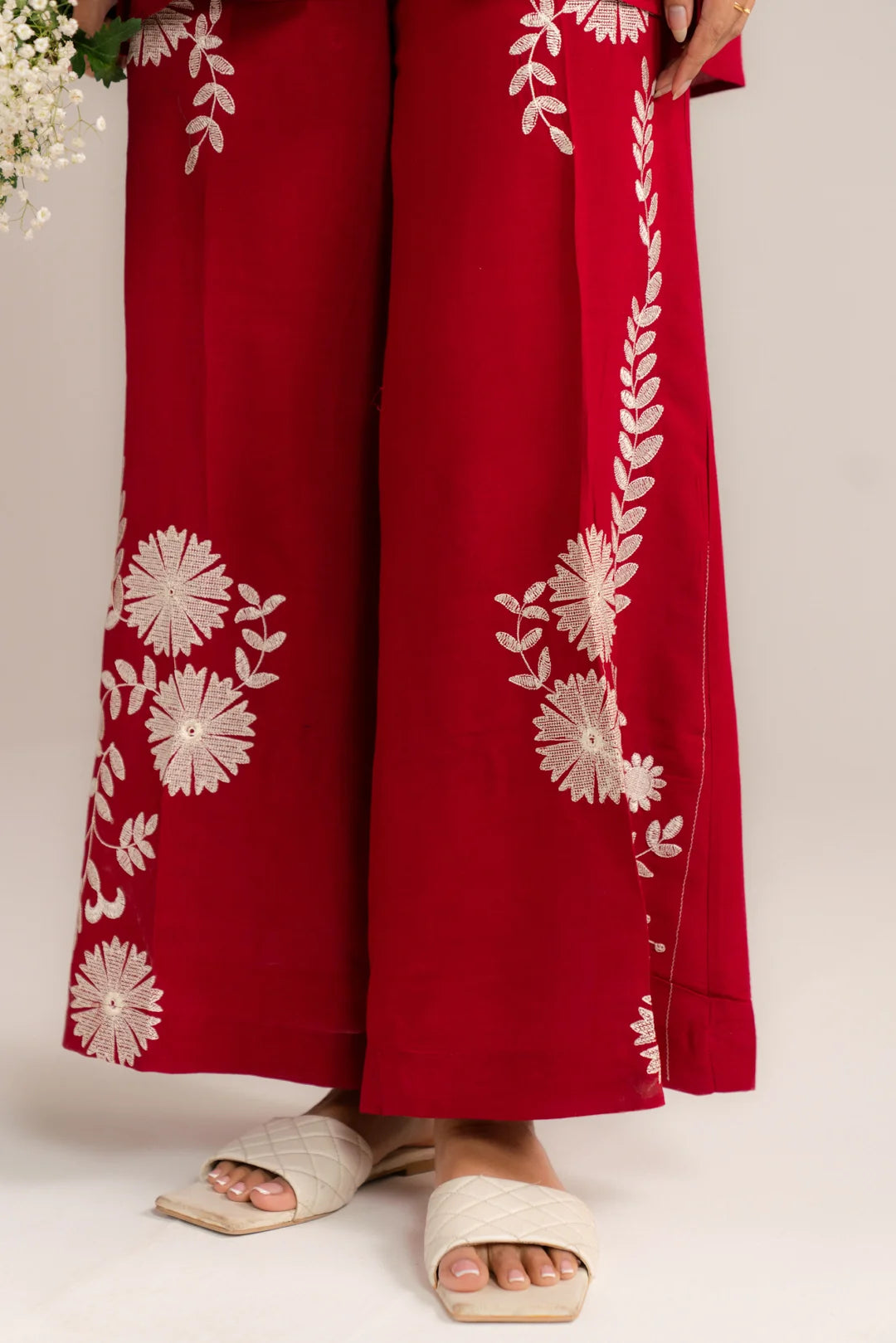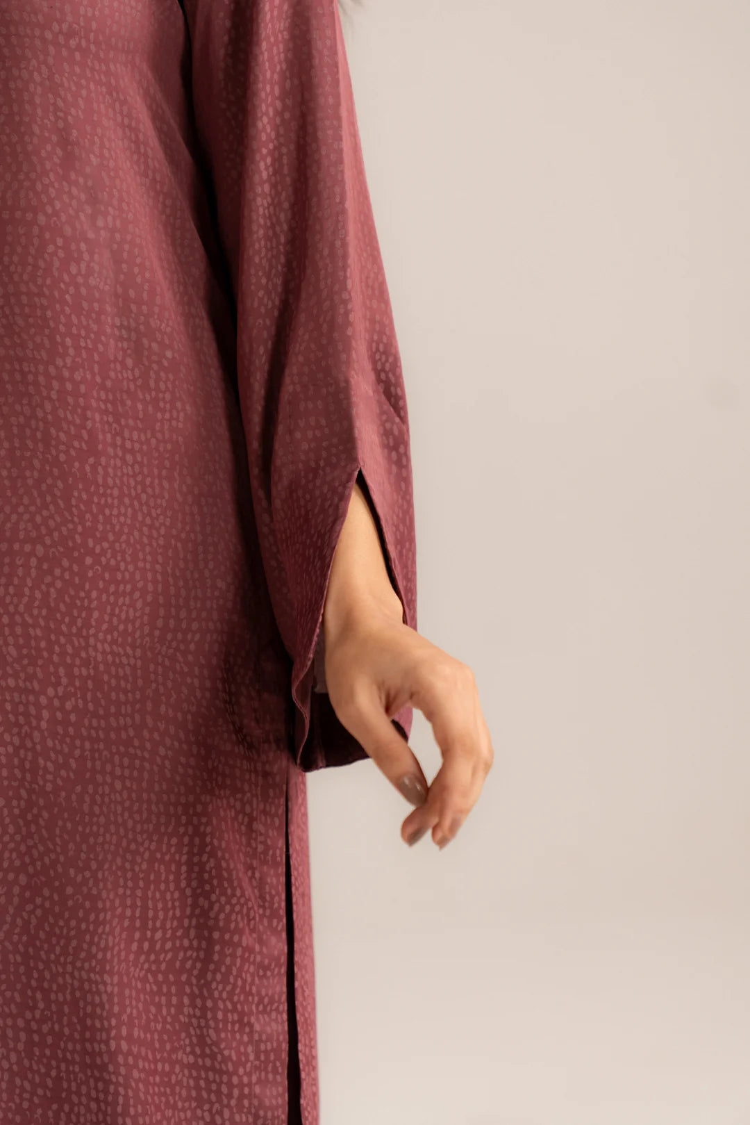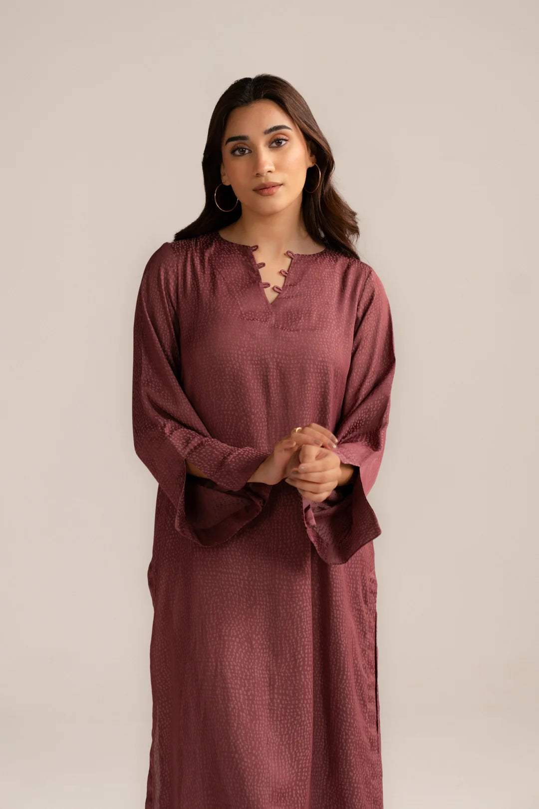 - Deep Bordeaux Kurti: Deep purple kurti with monochrome embroidery. Fabric: Khaddar.