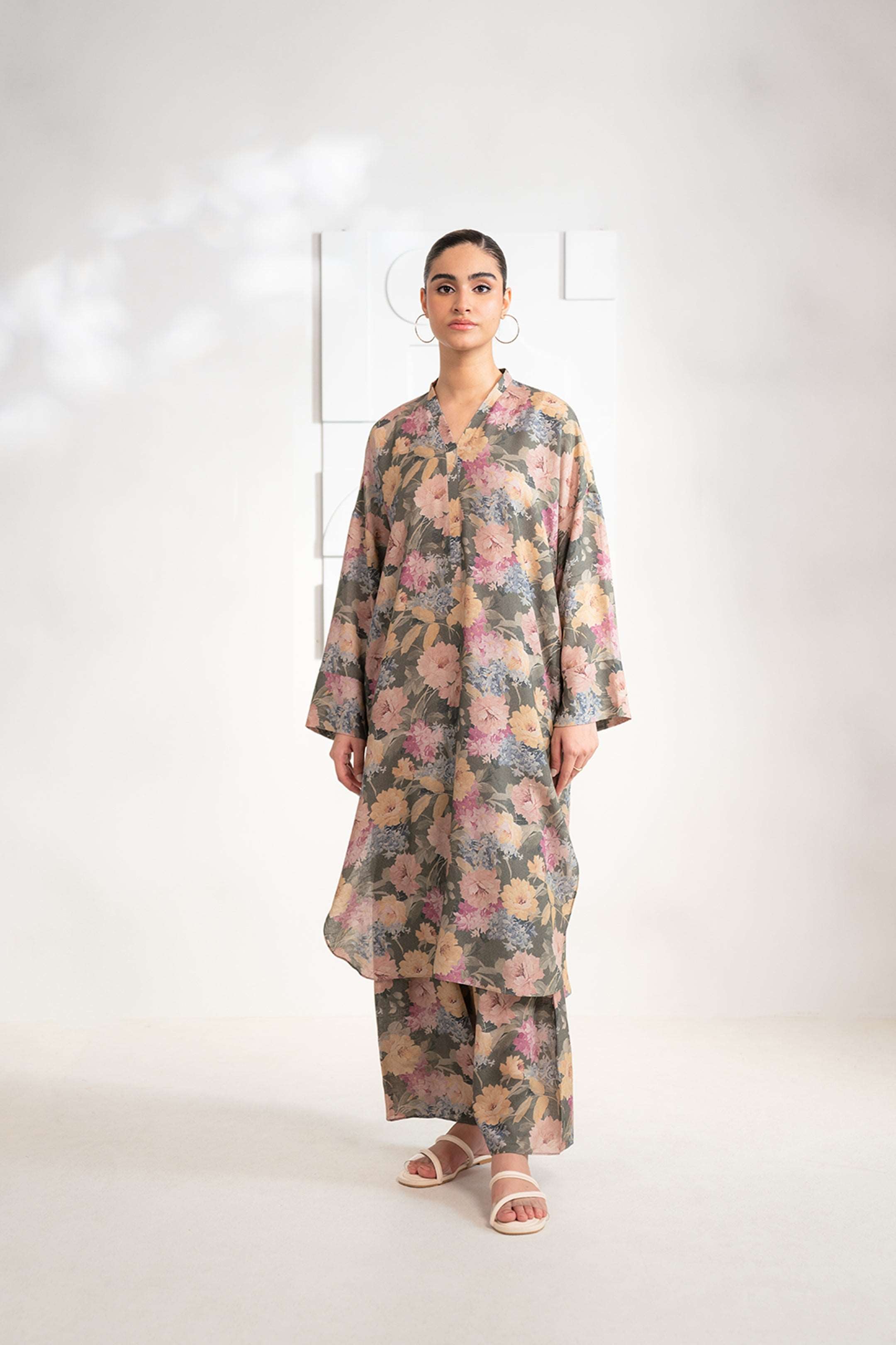 1 Piece Printed Linen Shirt – elegant fawn base kurti with Mughal-inspired floral jaal print for women.
