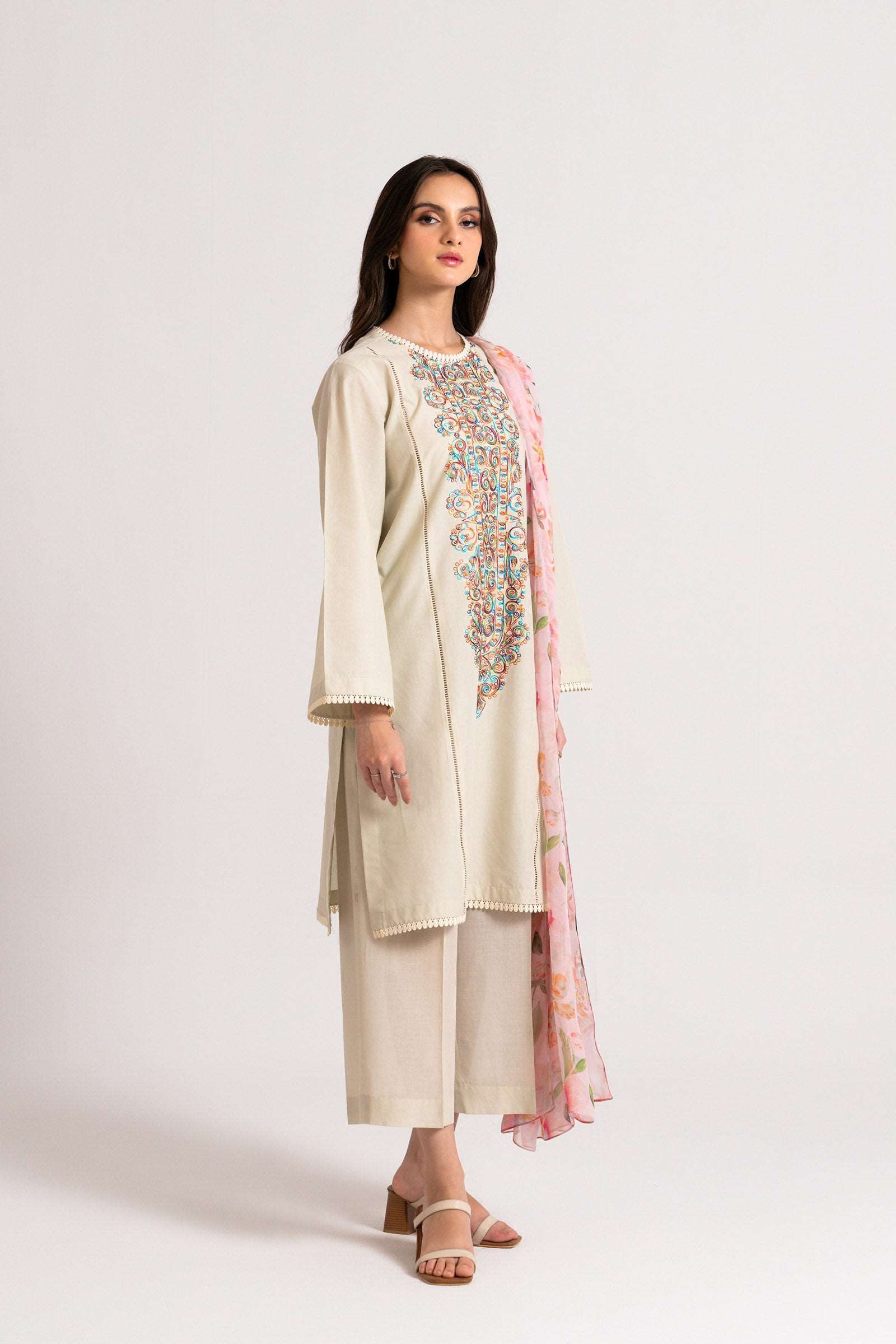 Off white 2 piece embroidered lawn suit with digital printed linen shirt and doriya dupatta, perfect for stylish women in Defence Hyderabad