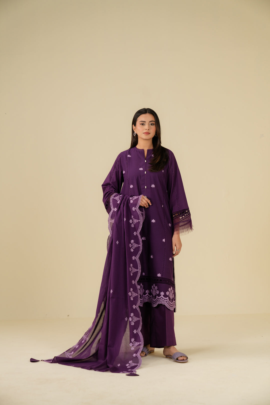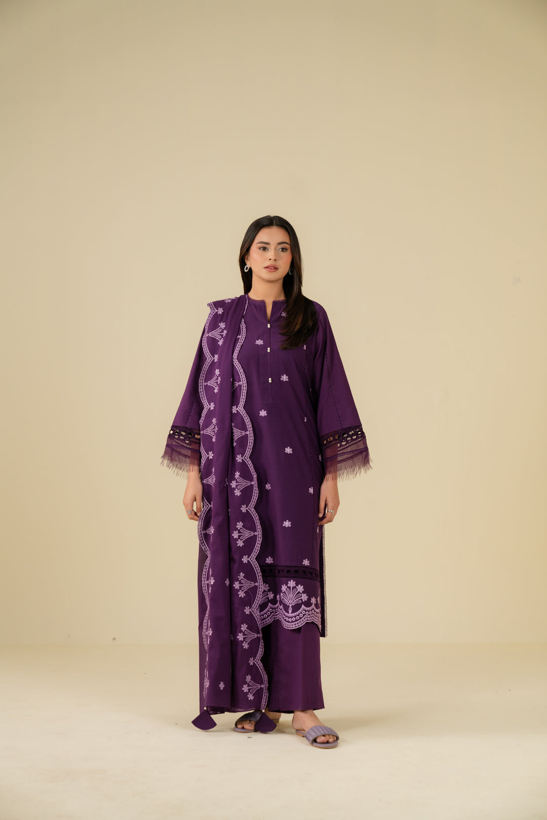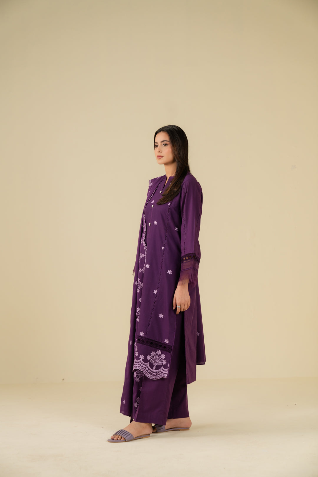 Purple 2 piece linen suit – embroidered digital printed shirt with organza border and doriya dupatta, premium winter collection for Pakistani women.