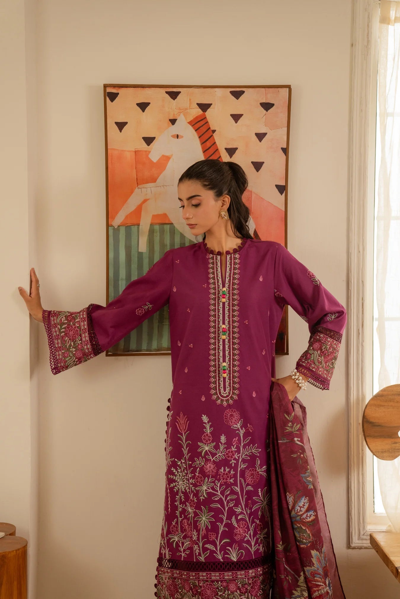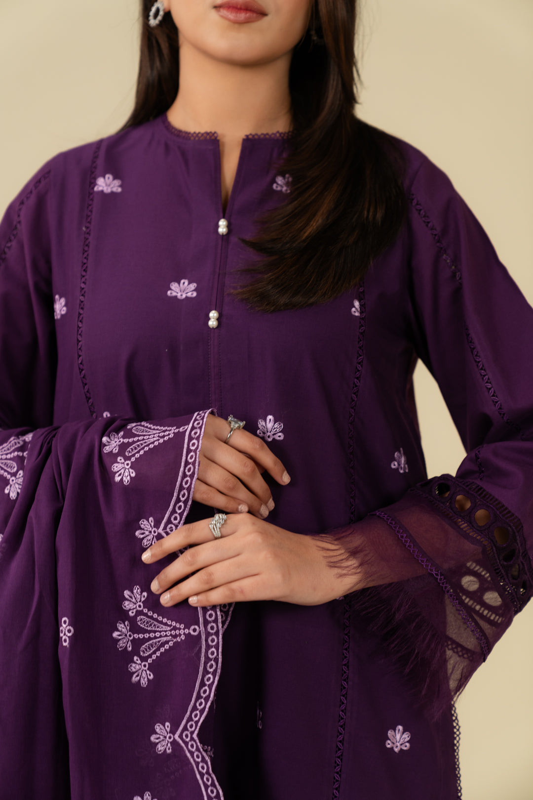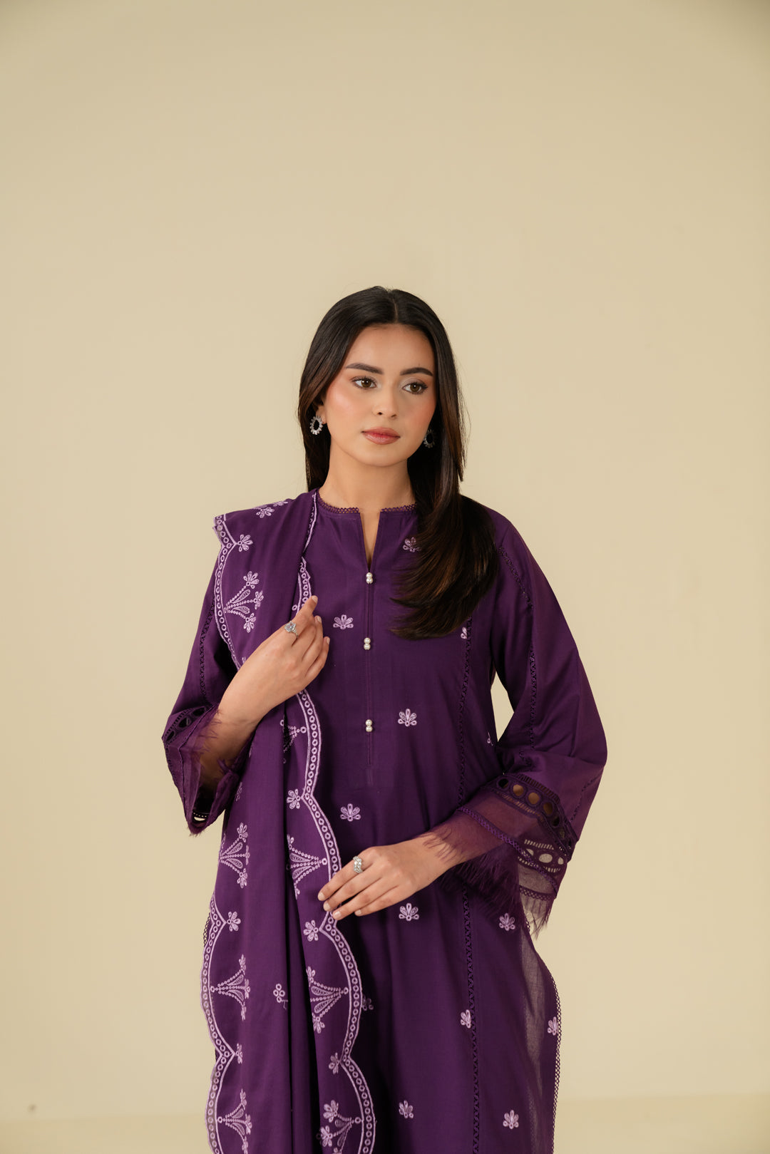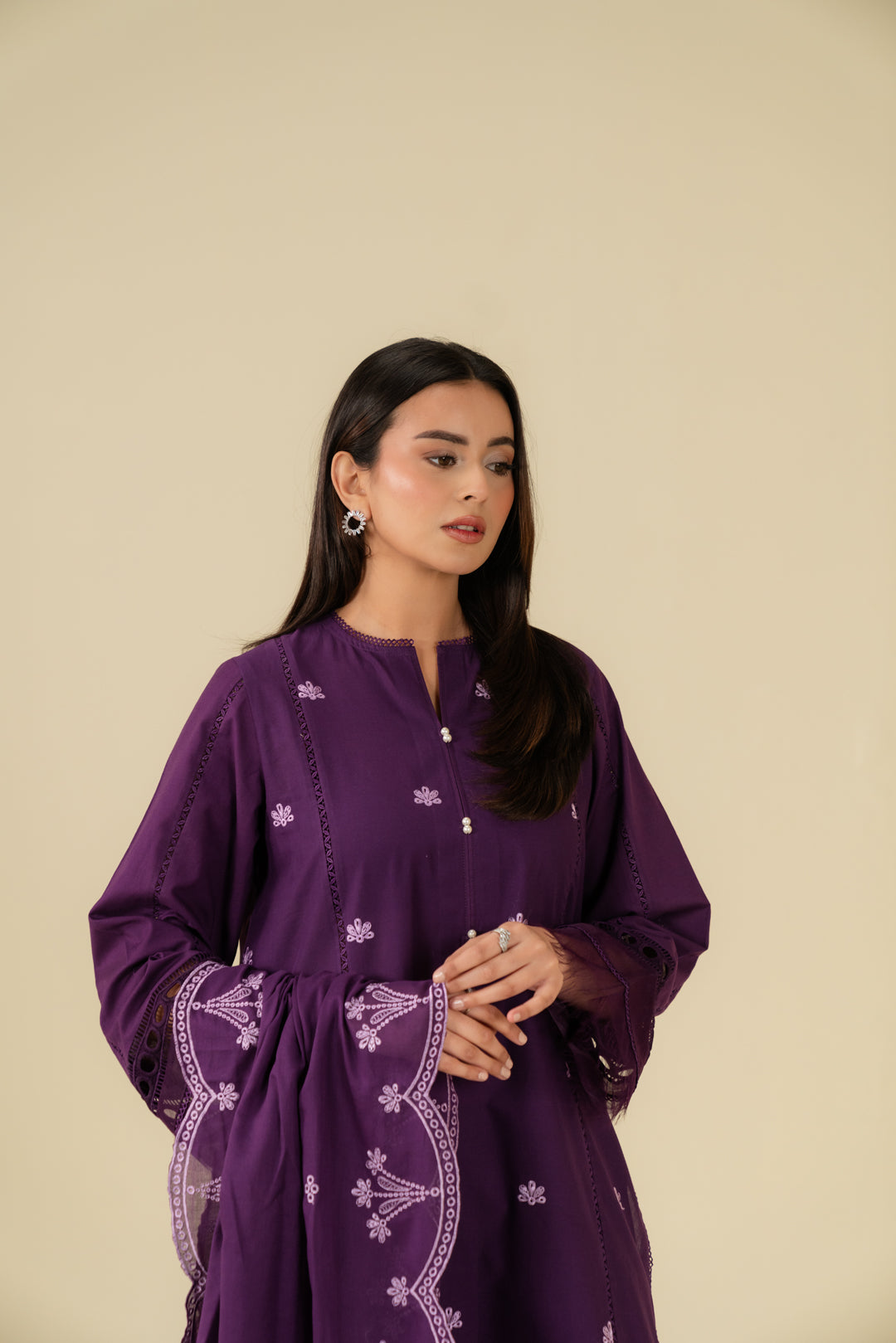 Purple 2 piece linen suit – embroidered digital printed shirt with organza border and doriya dupatta, premium winter collection for Pakistani women.
