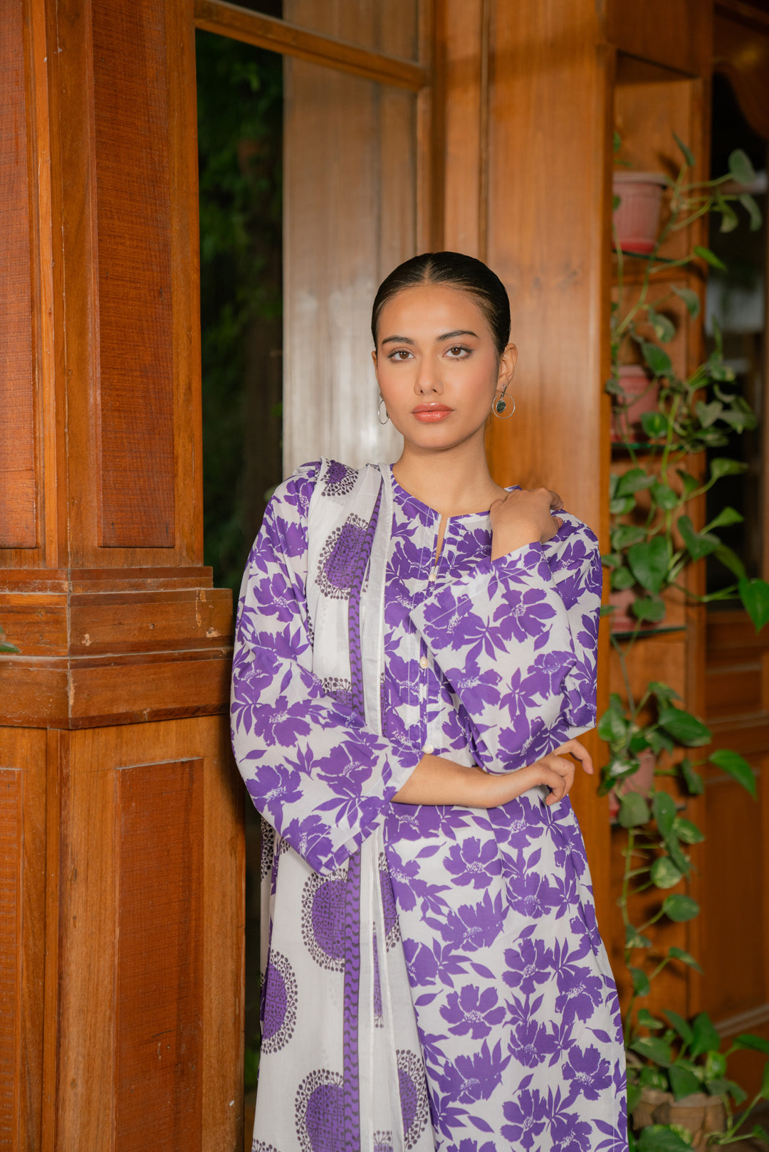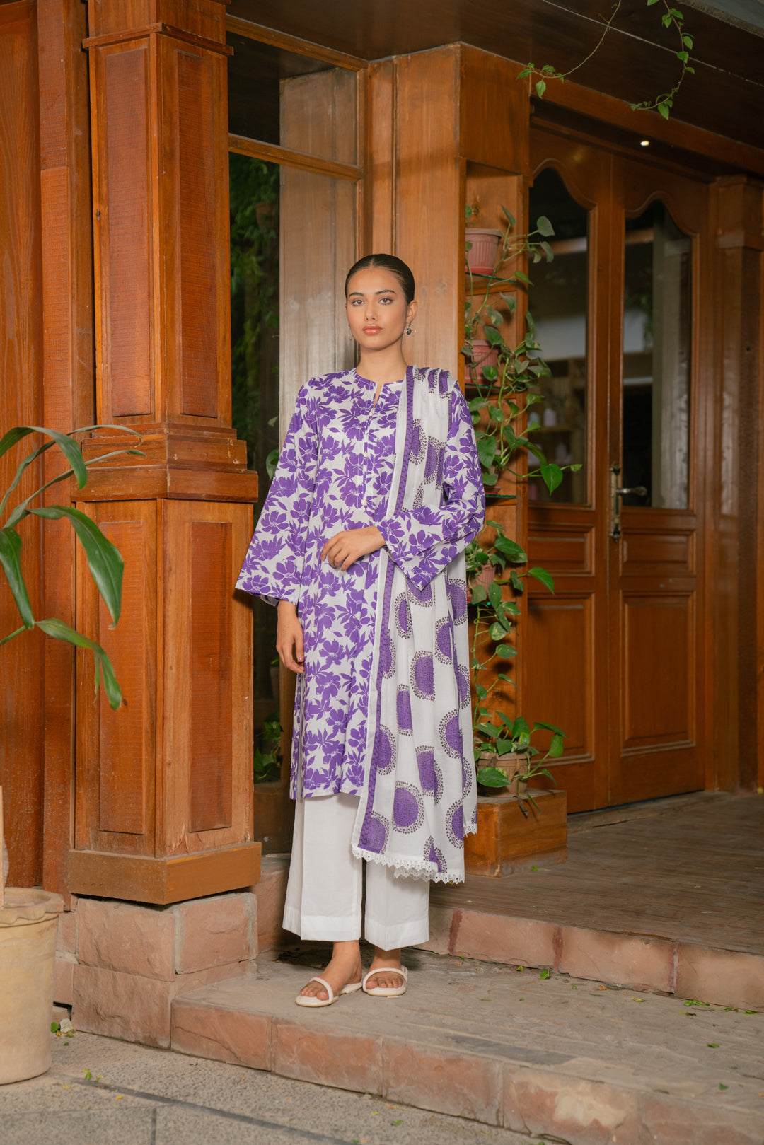 Elegant printed lawn dress design featuring an ikkat-patterned shirt with a bold Monark dupatta in striking purple hues on an off-white base.
