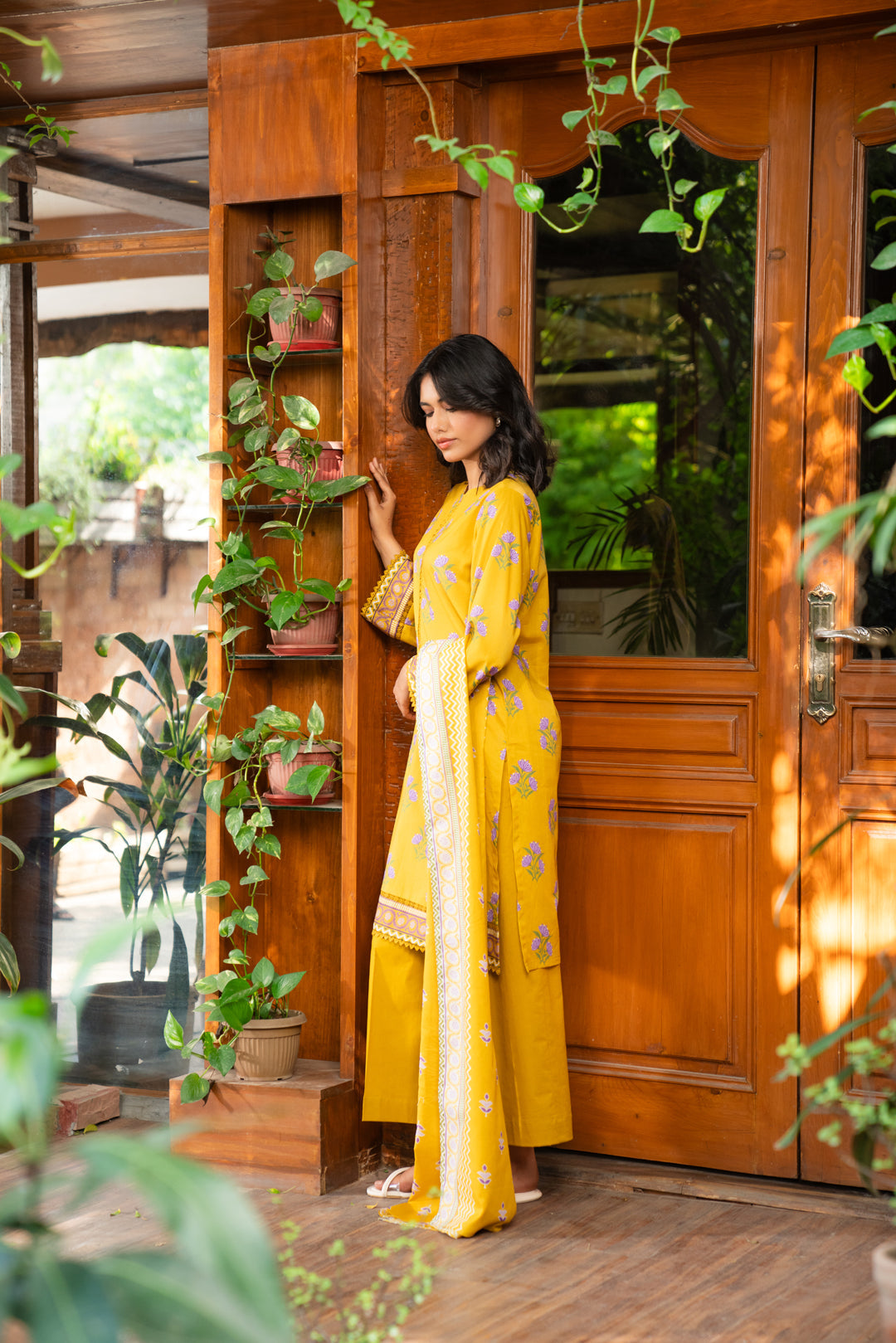 Dubai online lawn suits – yellow 3 piece printed lawn outfit with digital shirt, cambric trouser, and voile dupatta, stylish unstitched suits for women