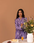 This enchanting lilac shirt adorned with tropical prints paired by solid bottom.
