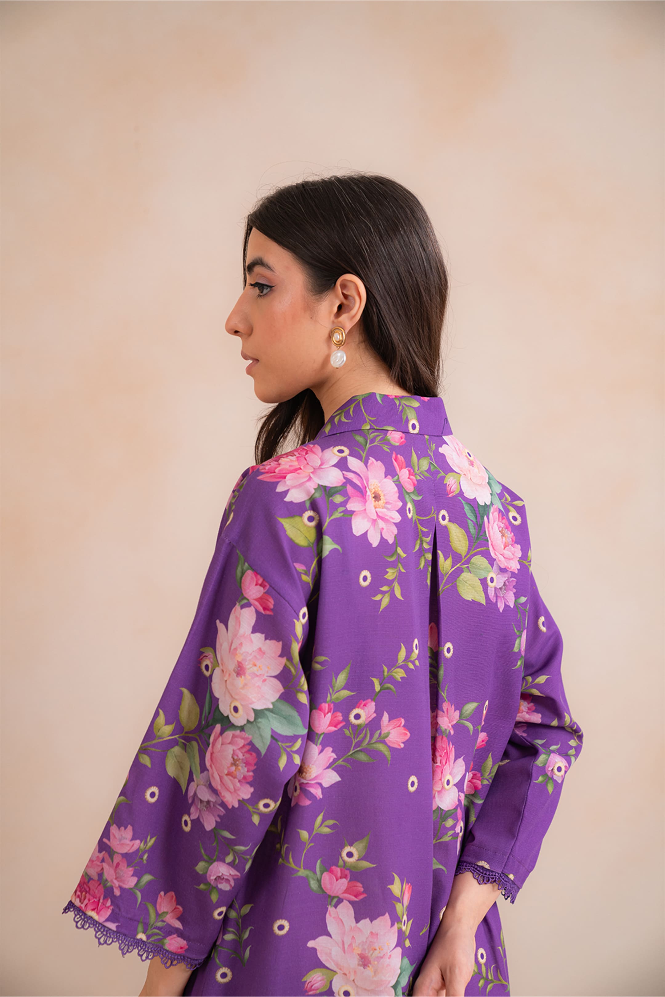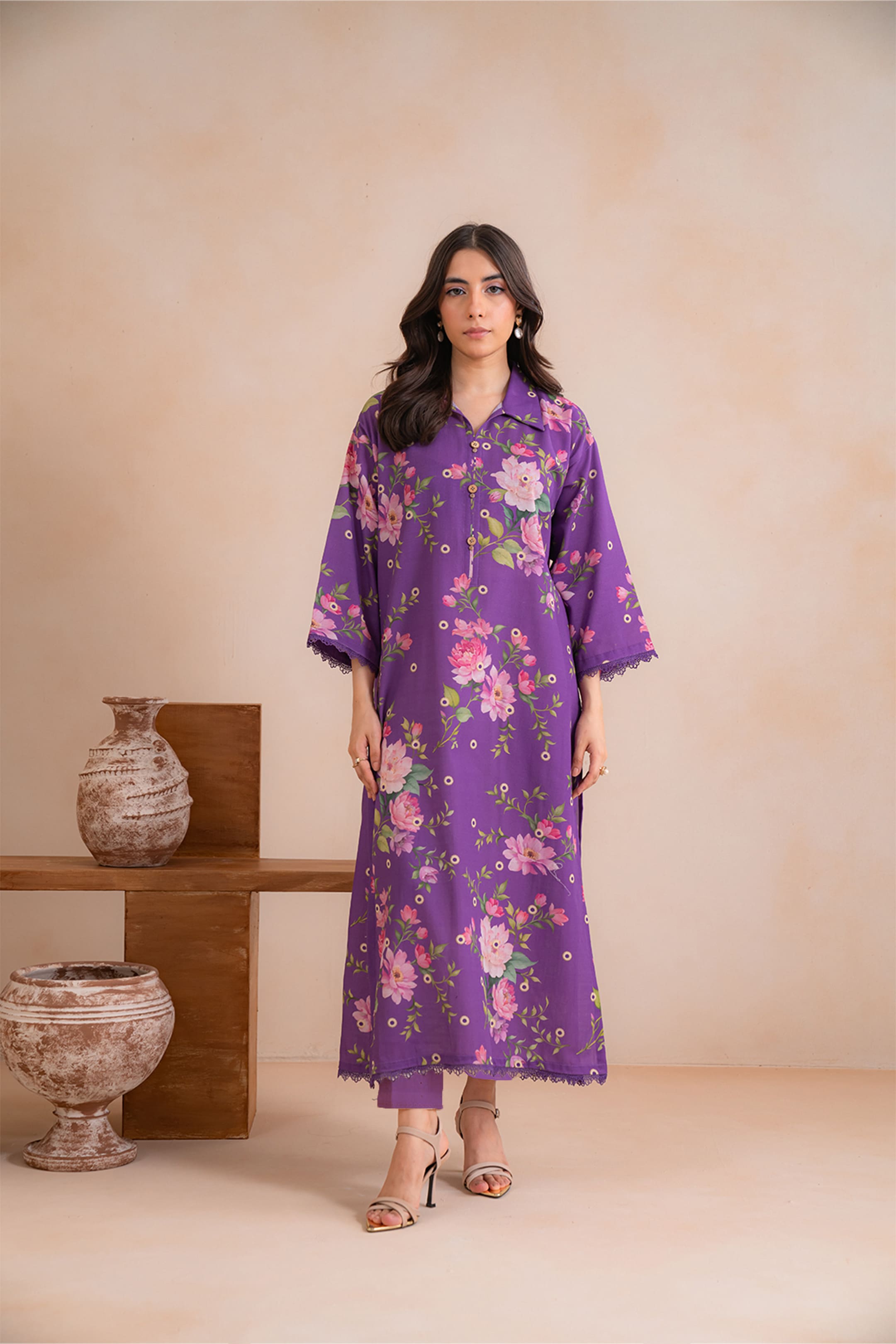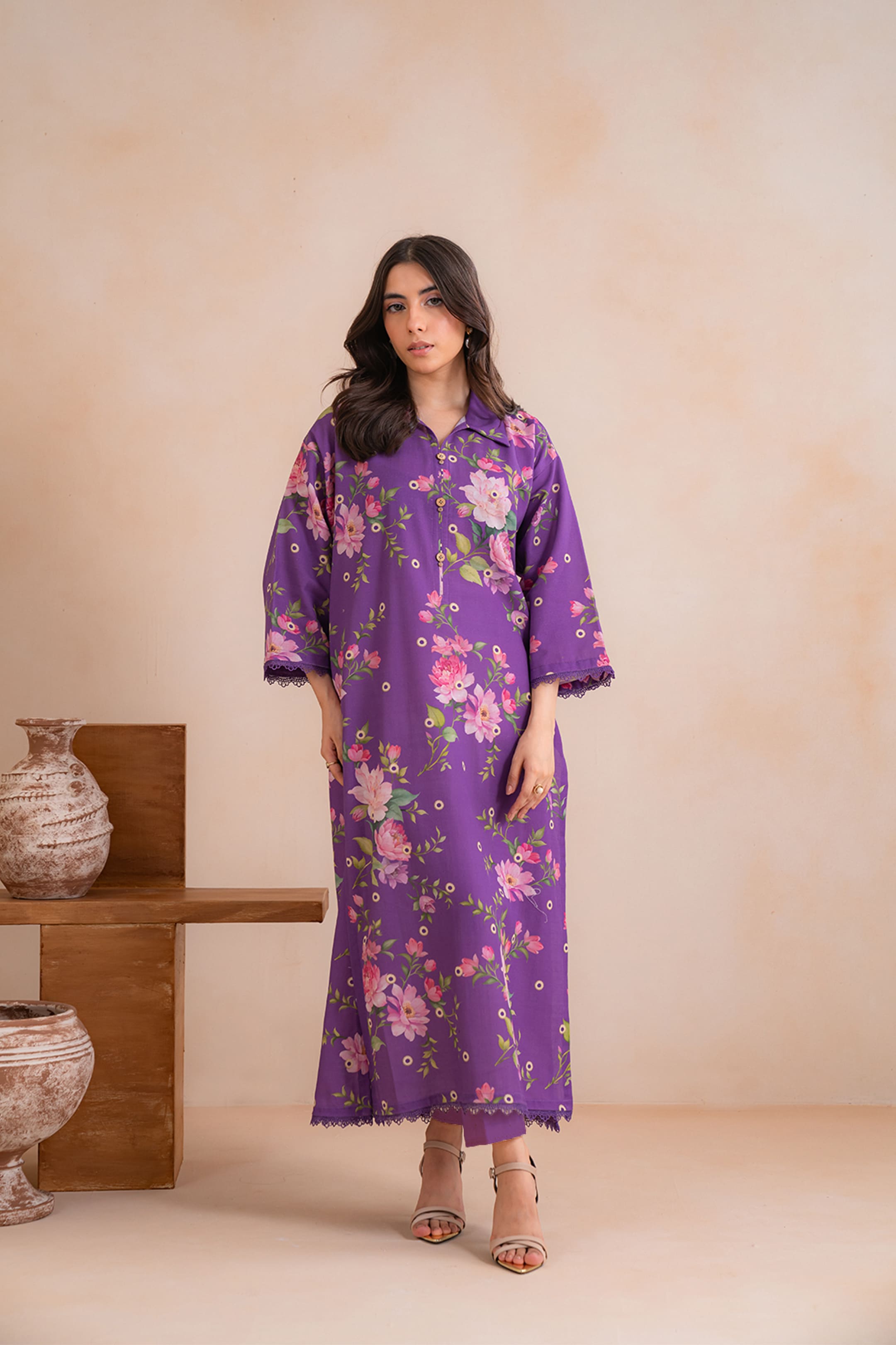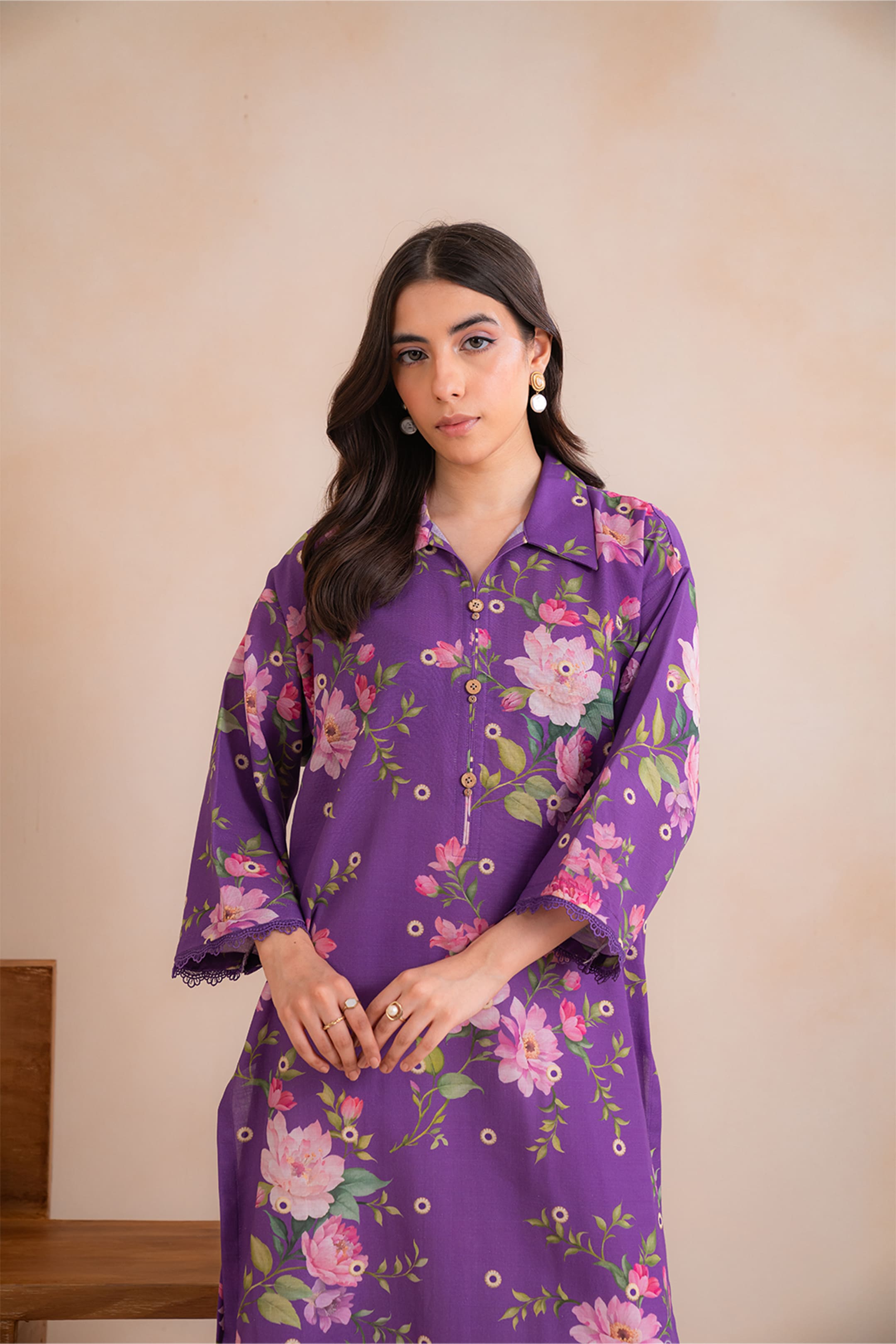 Elevate your style with this floral lavender bloom khaddar suit, with vibrant digital printed floral pattern. Perfect for casual wear.