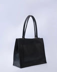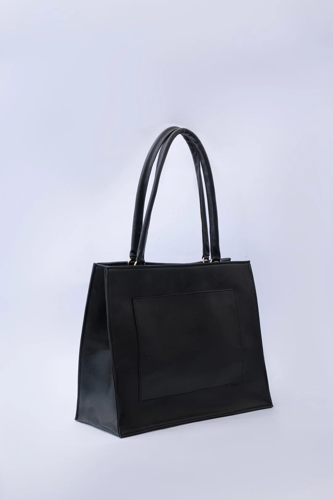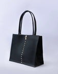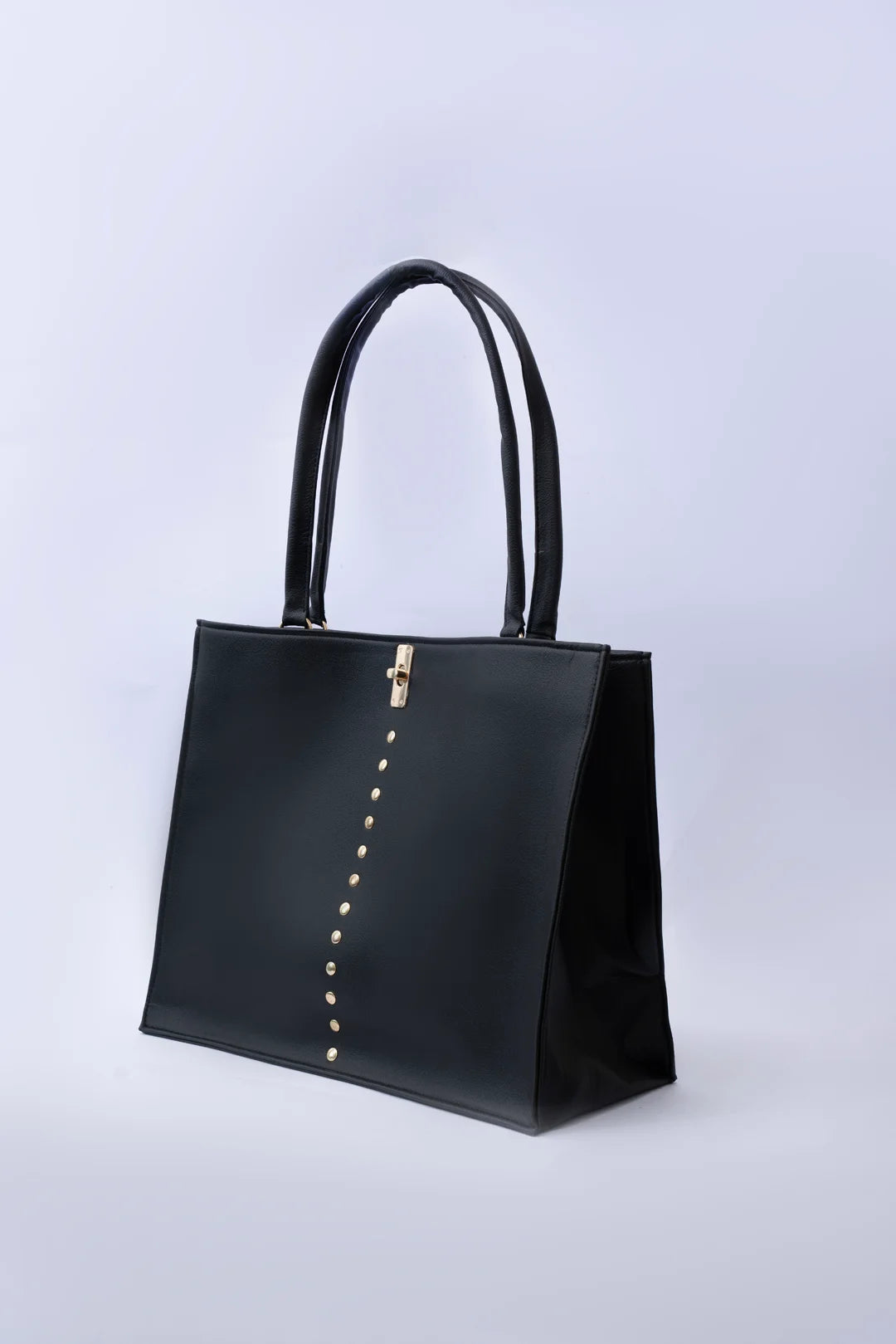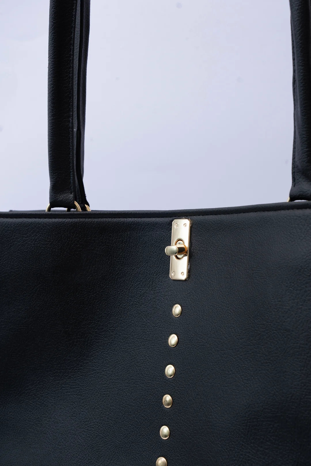Elevate your everyday style with this chic black tote bag. Featuring a sleek design with subtle metallic accents down the front, it offers both elegance and practicality. Perfect for work, shopping, or outings, this spacious bag combines fashion and function effortlessly.