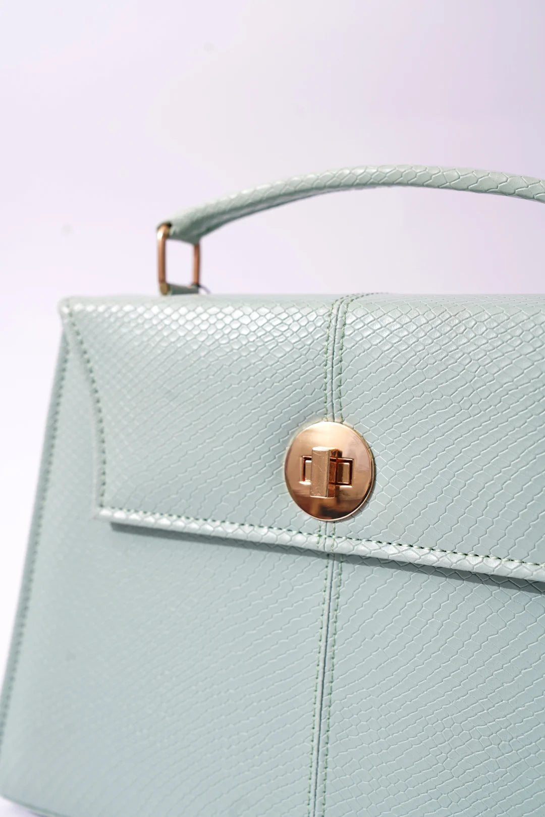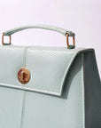 This elegant structured handbag in a pastel mint hue features a sleek, textured finish with a refined top handle and gold-tone hardware. Designed with a classic flap closure and a secure twist lock, it also includes a detachable shoulder strap for versatile styling. Perfect for adding a sophisticated touch to any outfit.