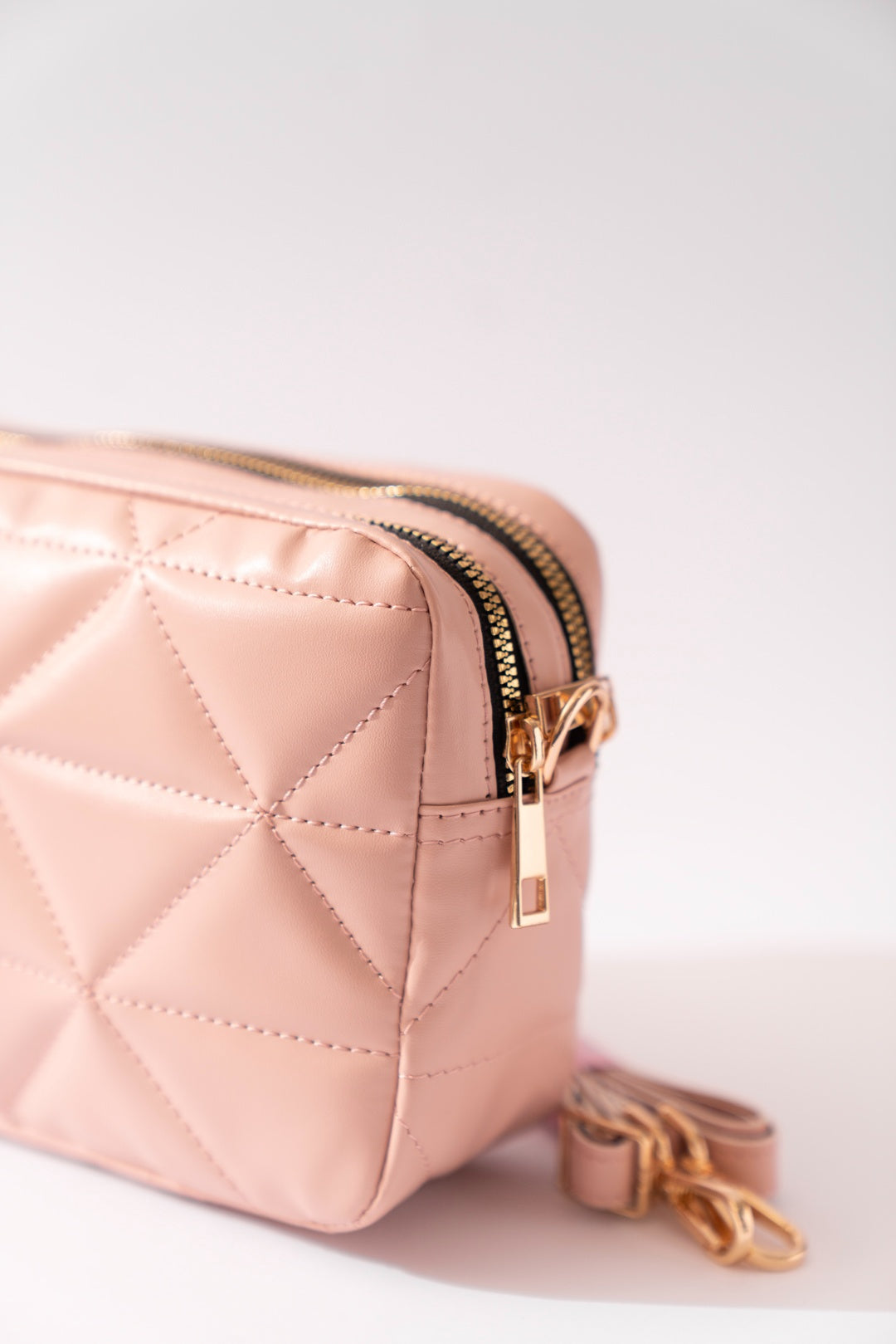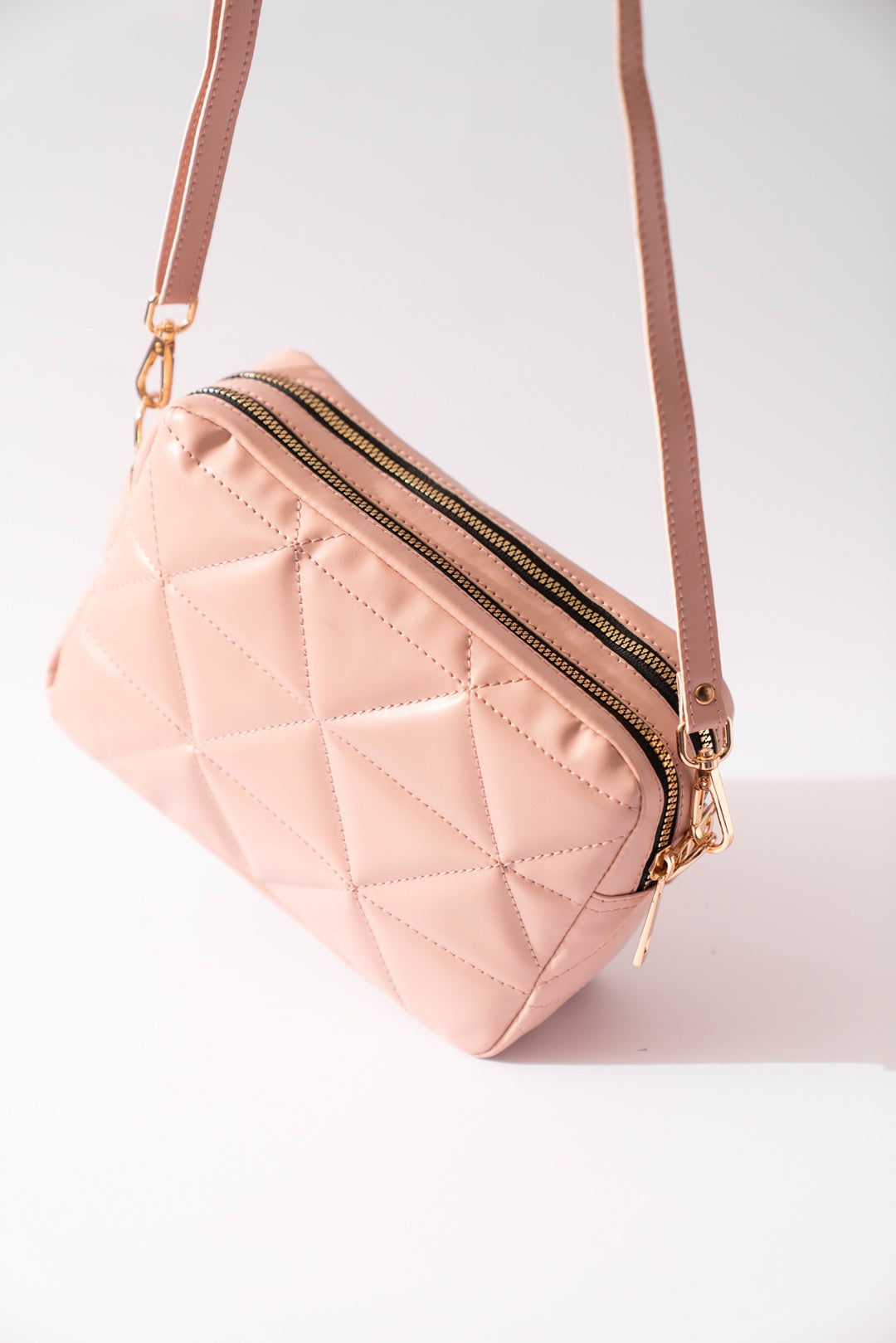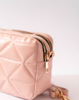 This elegant pink crossbody bag features a quilted design with a sleek, minimalist aesthetic. It has two zippered compartments with gold-tone hardware for secure storage. The detachable and adjustable strap offers versatility, making it a stylish yet practical accessory for everyday use.