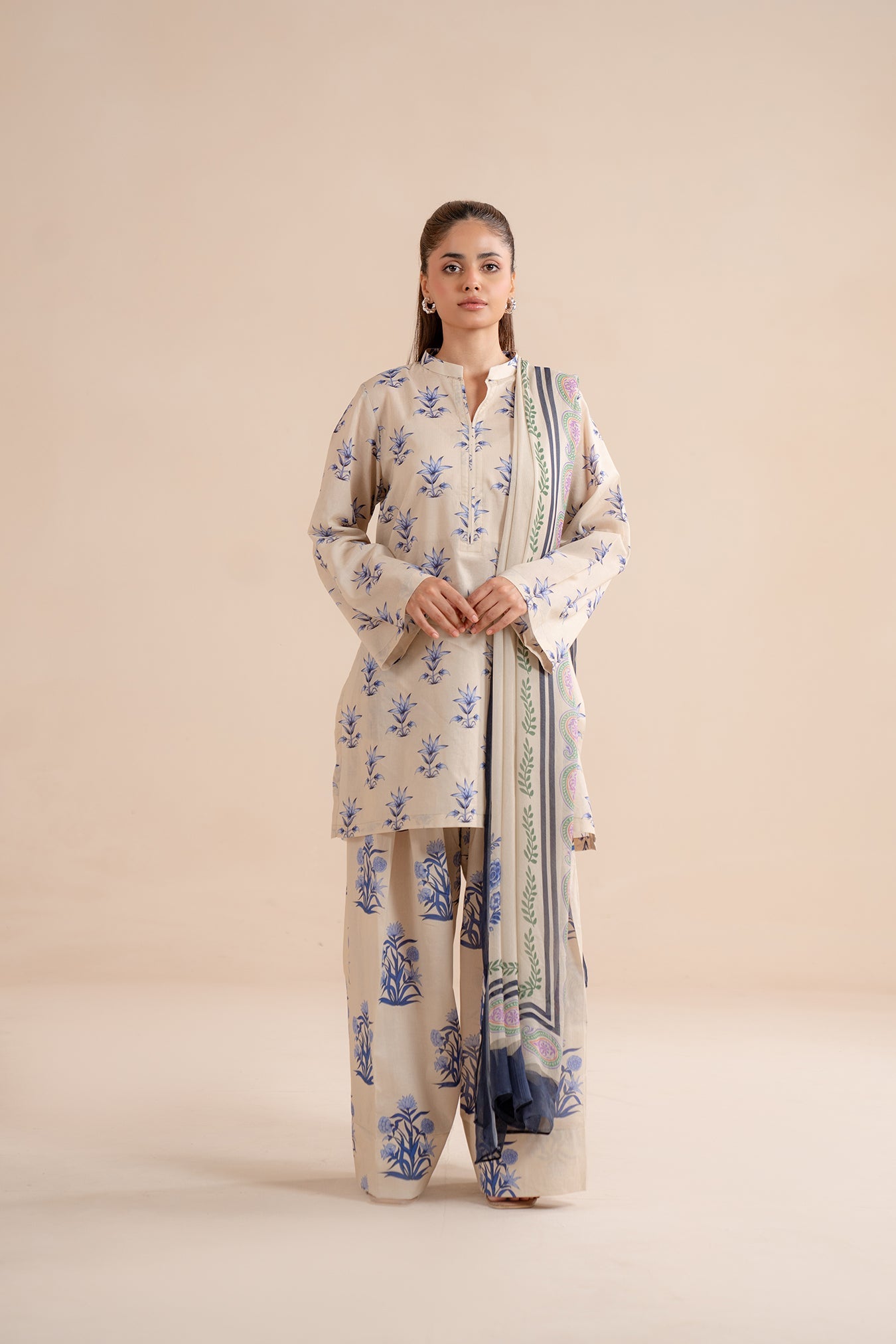 This elegant lawn Three-piece features a cream-colored printed tunic with blue floral motifs and farshi shalwar, perfect for a stylish and graceful look.