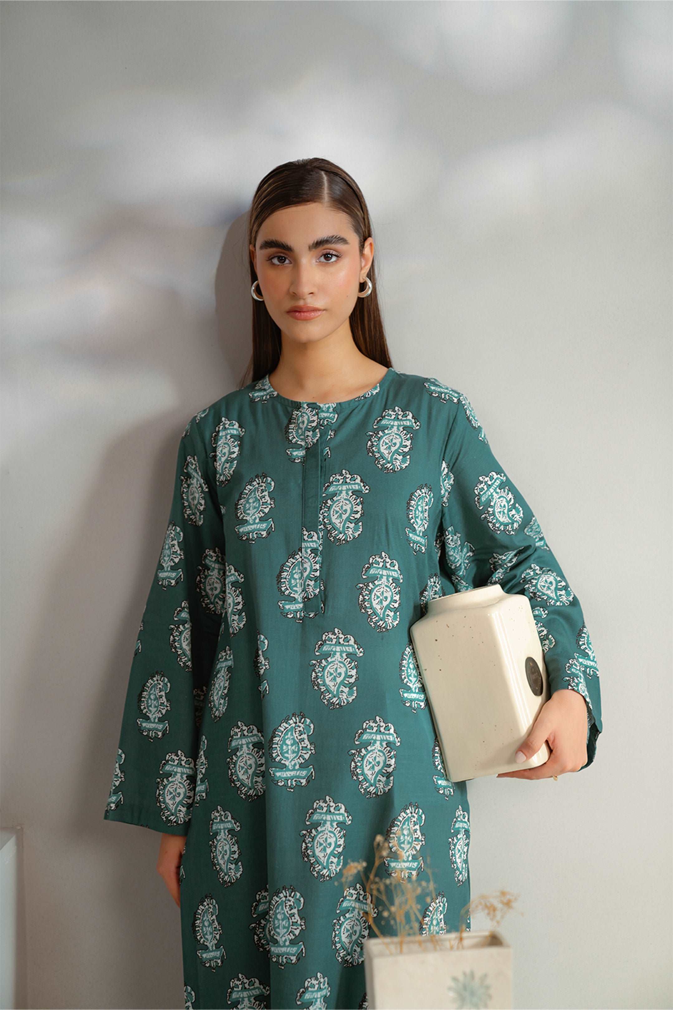 A captivating composition layered over this graceful ensemble featuring contemporary shirt adorned with paisley print.