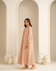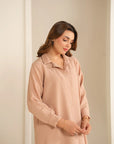 A stylish light brown long collared shirt, minimal, versatile, and perfect for an effortlessly chic look.