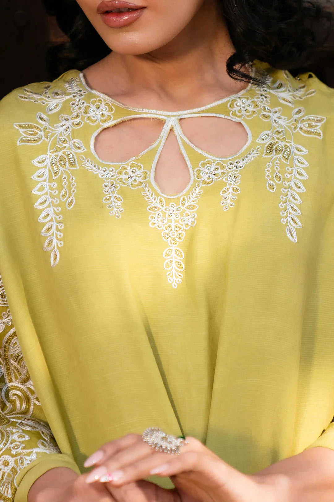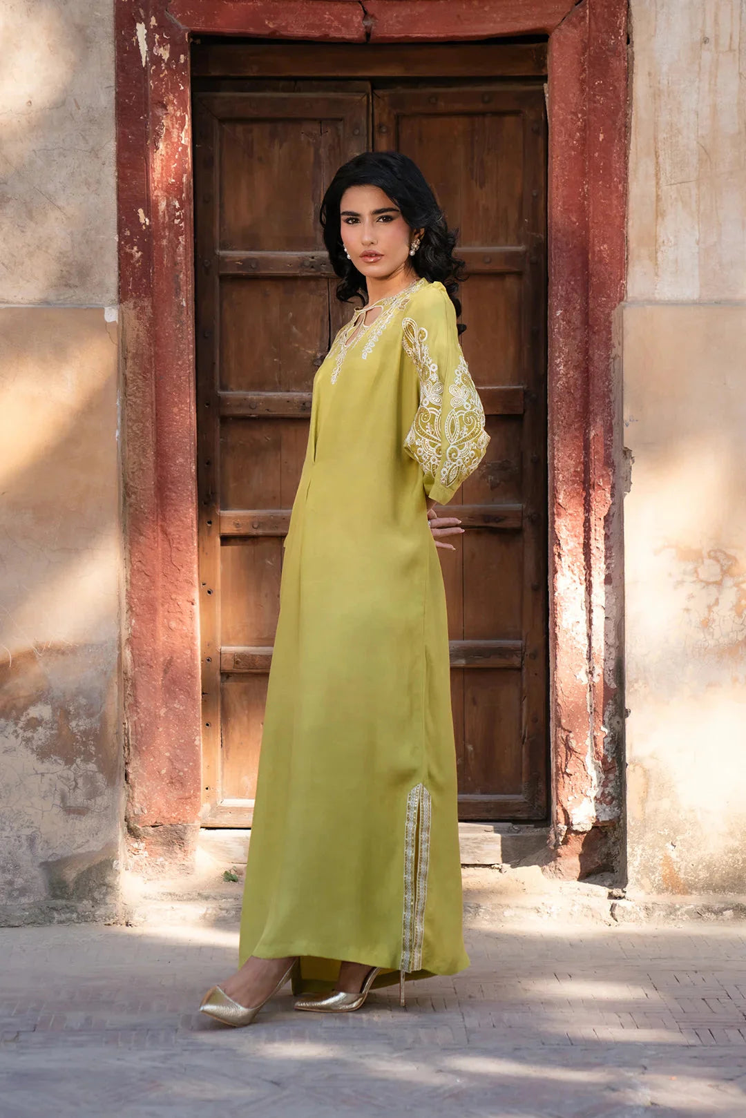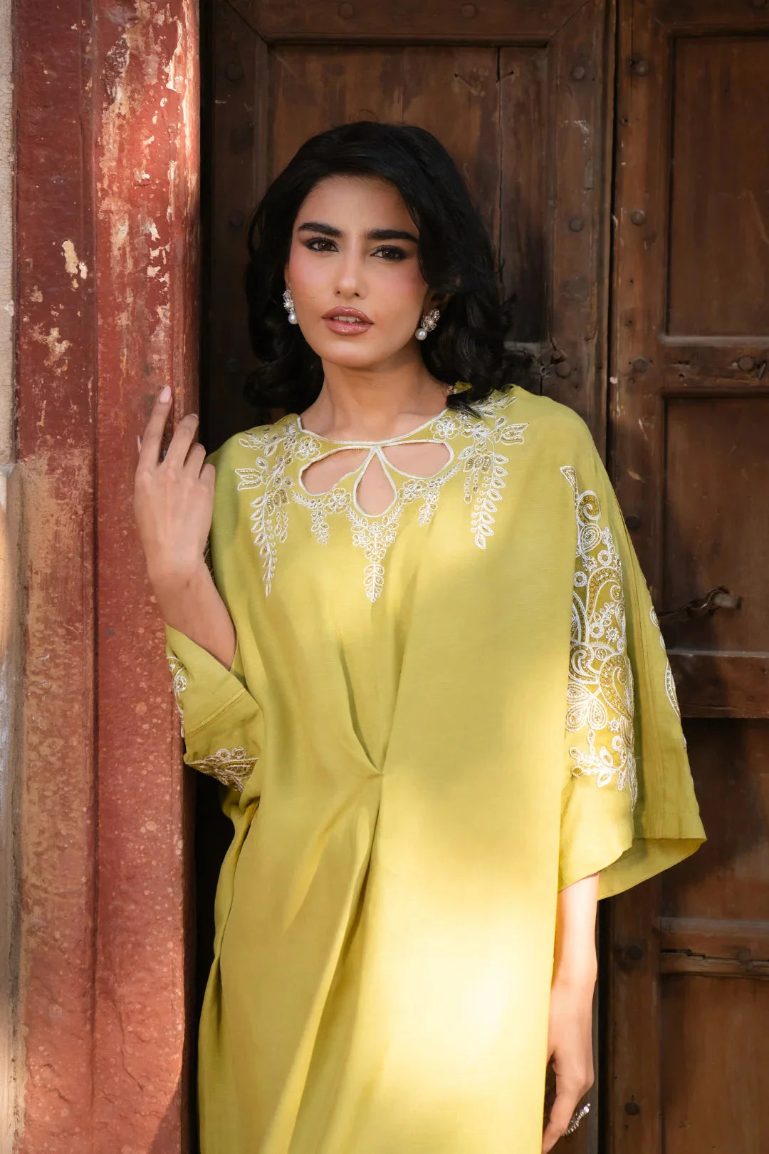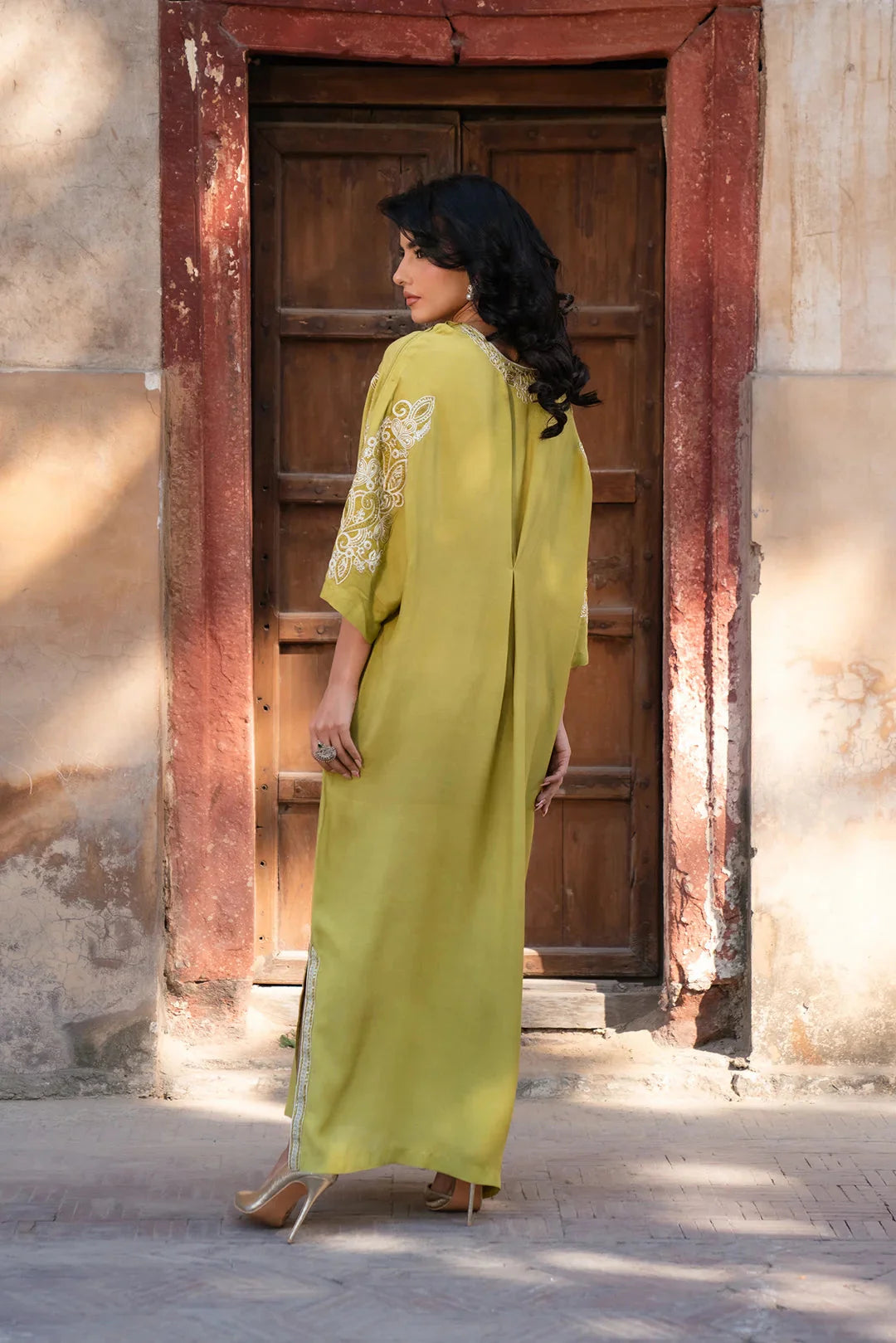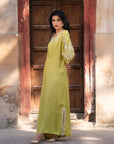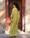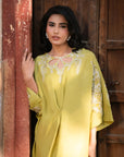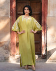 Make a statement with this cyber lime kaftan, crafted from luxurious raw silk. Featuring intricate embroidery on the neckline, shoulders, and sleeves, this flowing silhouette exudes elegance with a modern edge. Perfect for sophisticated gatherings and chic occasions!