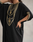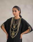 Elevate your style with this stunning black kaftan crafted from luxurious raw silk. Featuring a relaxed and flowing silhouette, this elegant piece is adorned with intricate gold embroidery along the neckline, sleeves, and hem, adding a touch of opulence and sophistication. Perfect for festive occasions, evening events, this versatile kaftan combines comfort with high fashion. Its timeless design and rich fabric make it a must-have addition to your wardrobe, offering a chic and graceful look for any special occasion.