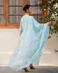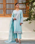 Beautiful pastel turquoise suit with intricate shimmery details making it a perfect with for all your day time weddings.