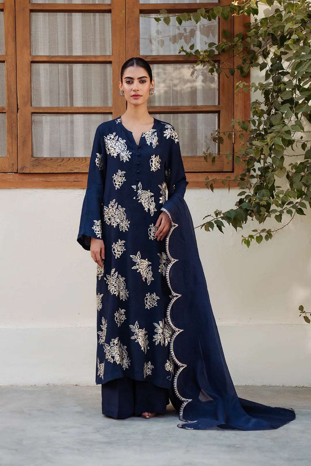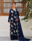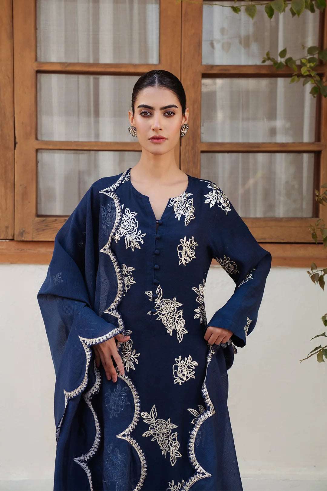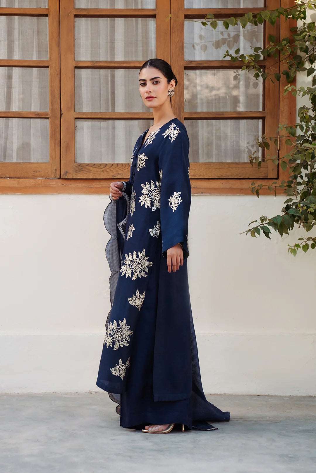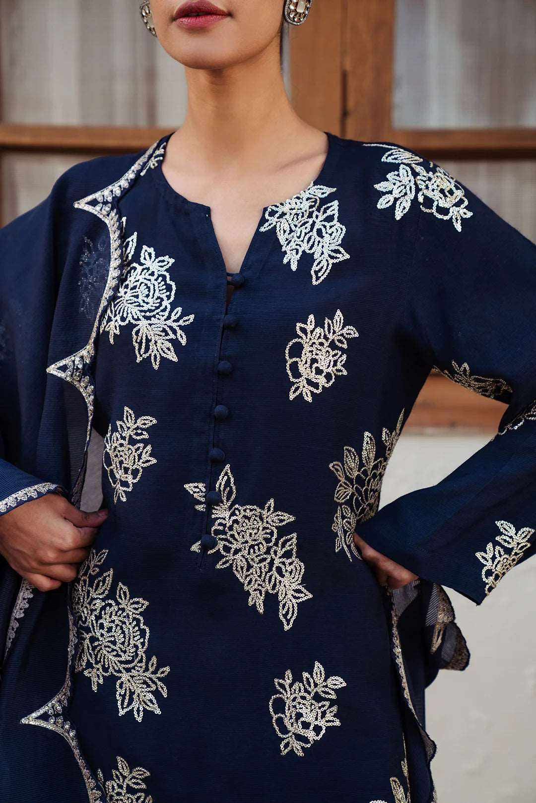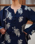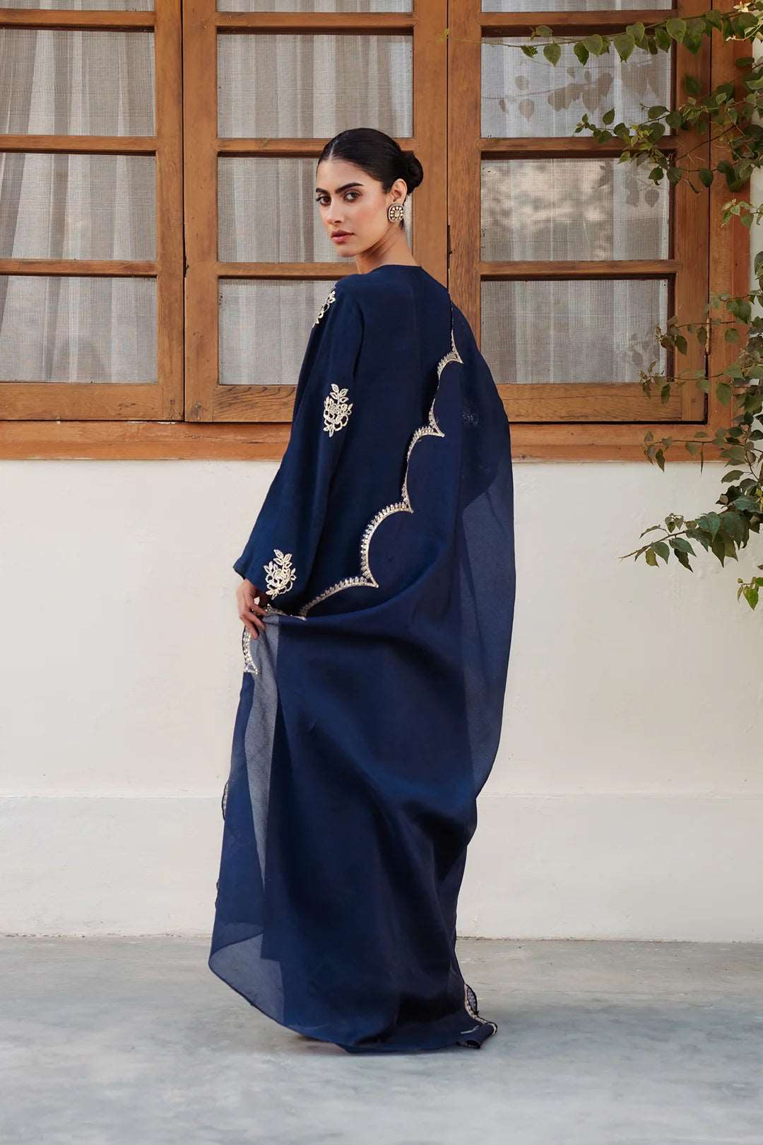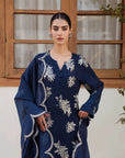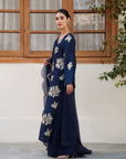 A perfect navy blue suit with intricate gold details complimented by a minimal cotton net dupatta, a perfect fit to your winter weddings!