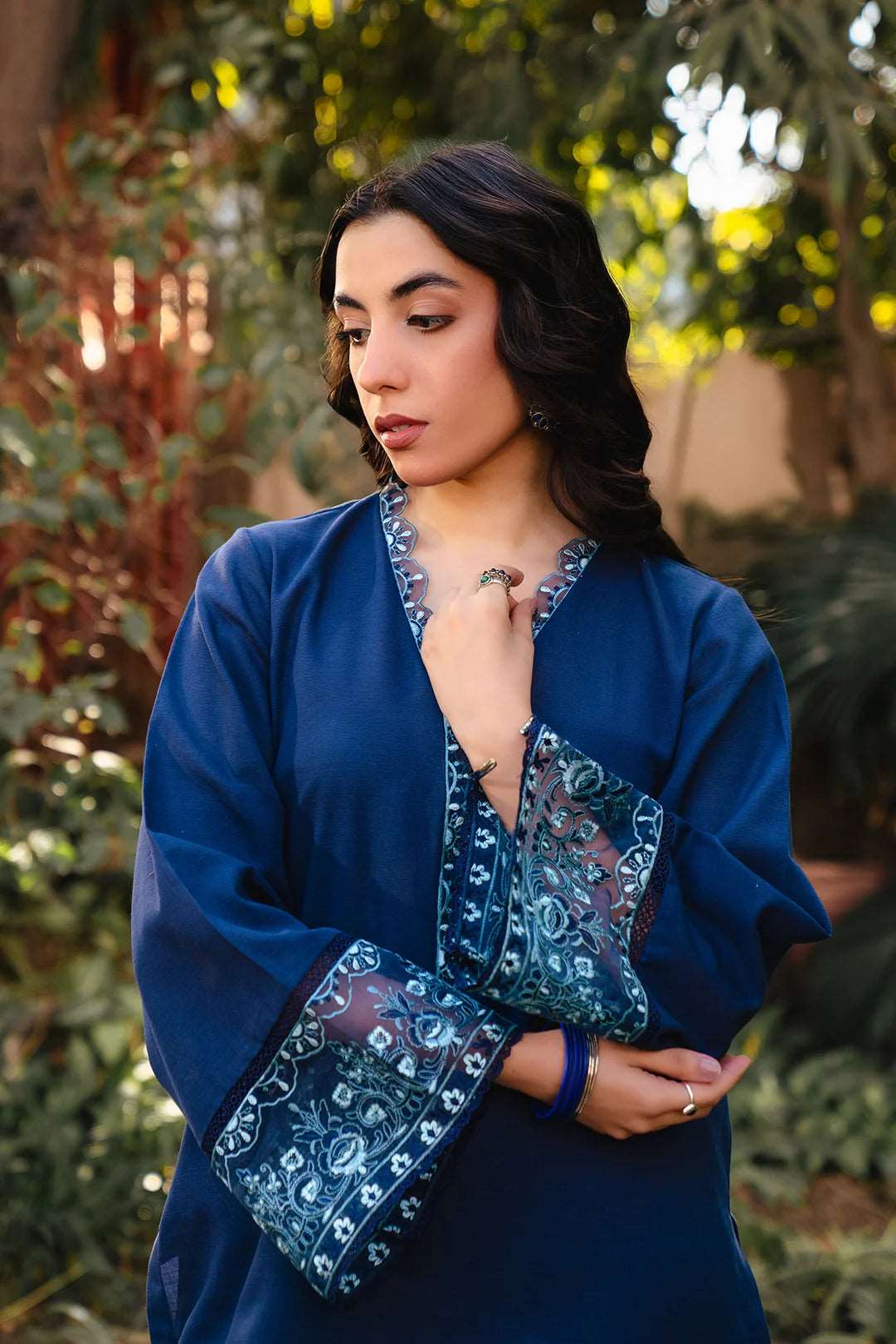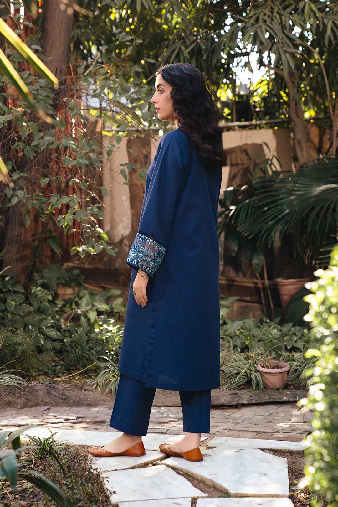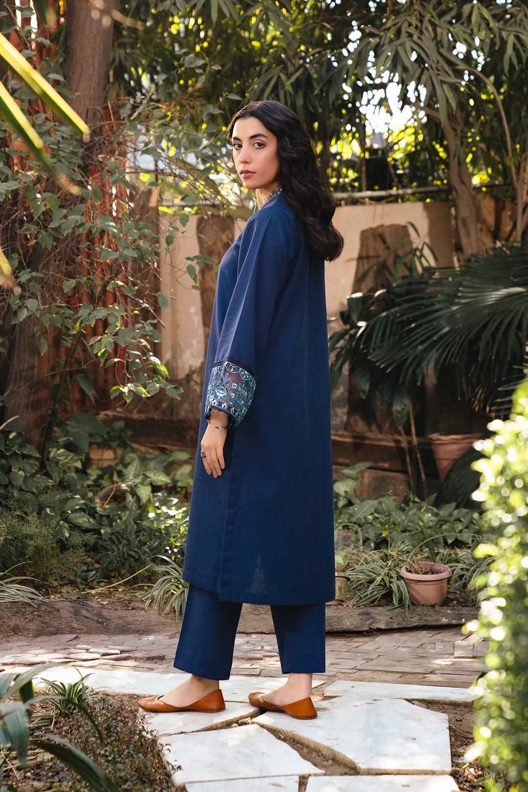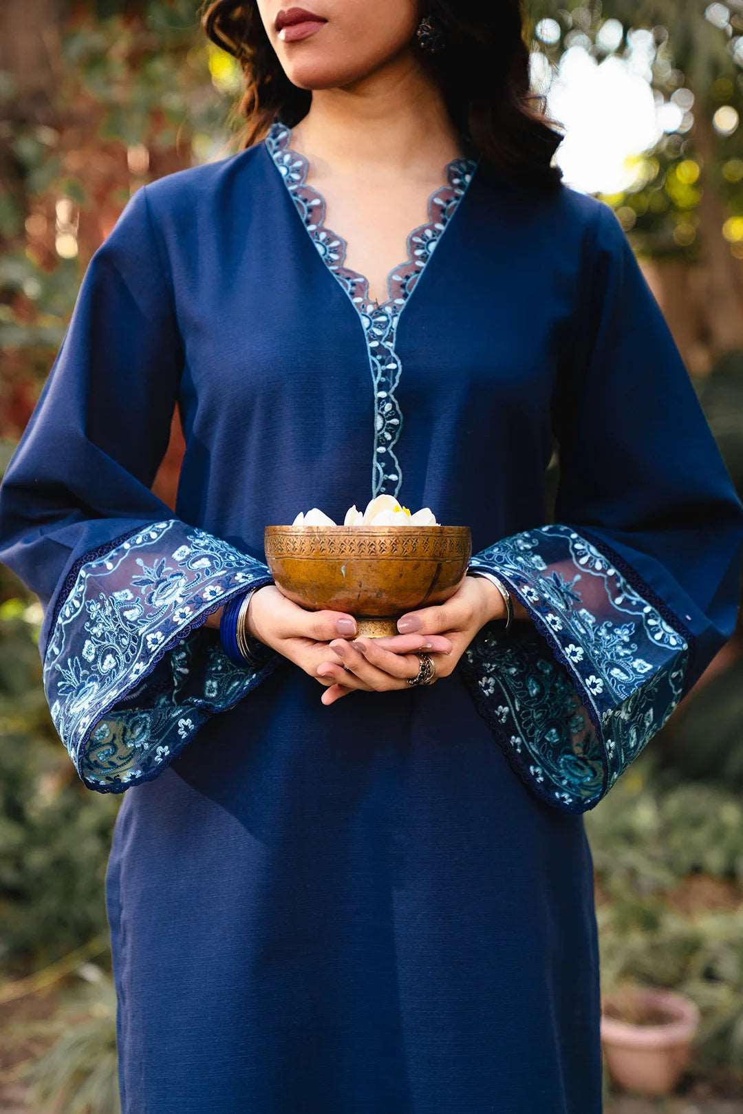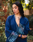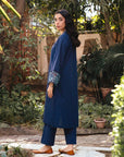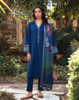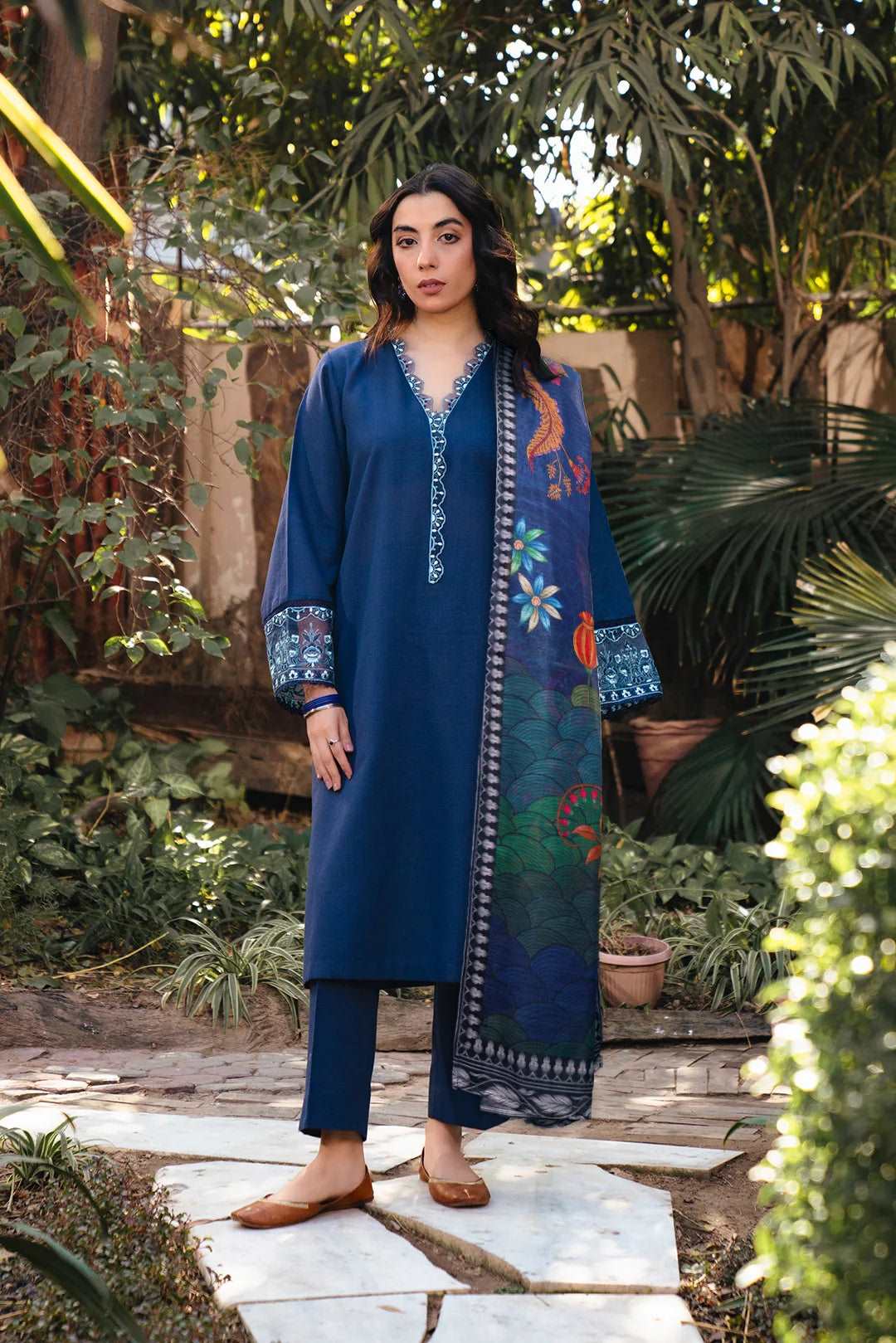 Deep blue khaddar 3-piece with minimal embroidery on the sleeves and neckline. Perfect blend of elegance and comfort for casual wear.