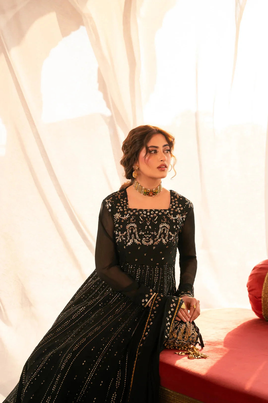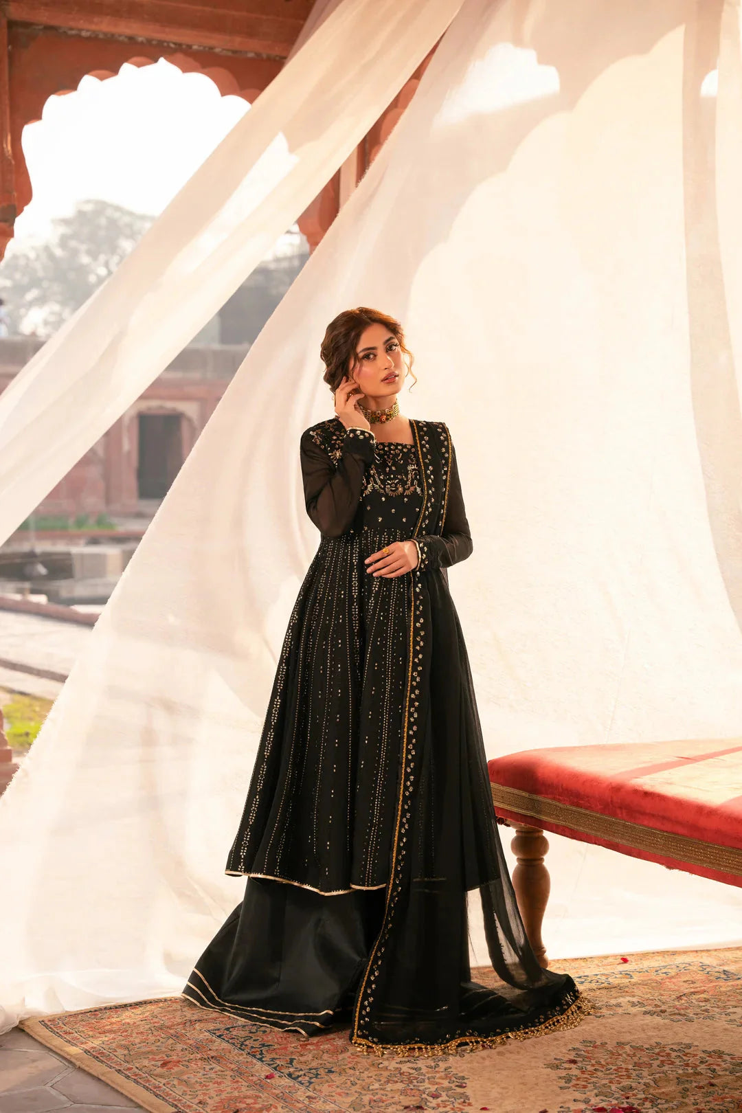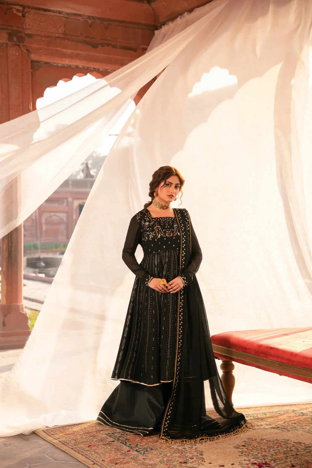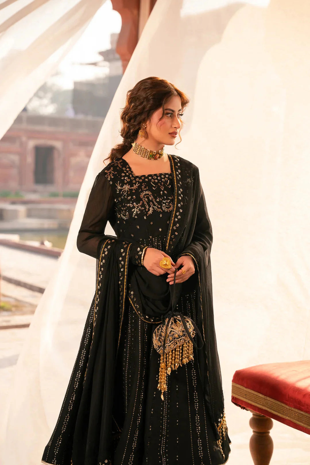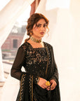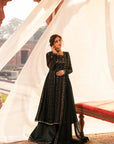 Make a statement with this graceful black embroidered Kalidar, crafted in premium chiffon fabric for a flowing, regal silhouette. Intricate embroidery adorns the bodice, sleeves, and panels, adding a touch of timeless elegance. Paired with a sleek raw silk trouser for a structured contrast, this ensemble exudes sophistication. The look is completed with a delicately embroidered chiffon dupatta, enhancing its festive charm.
