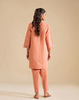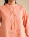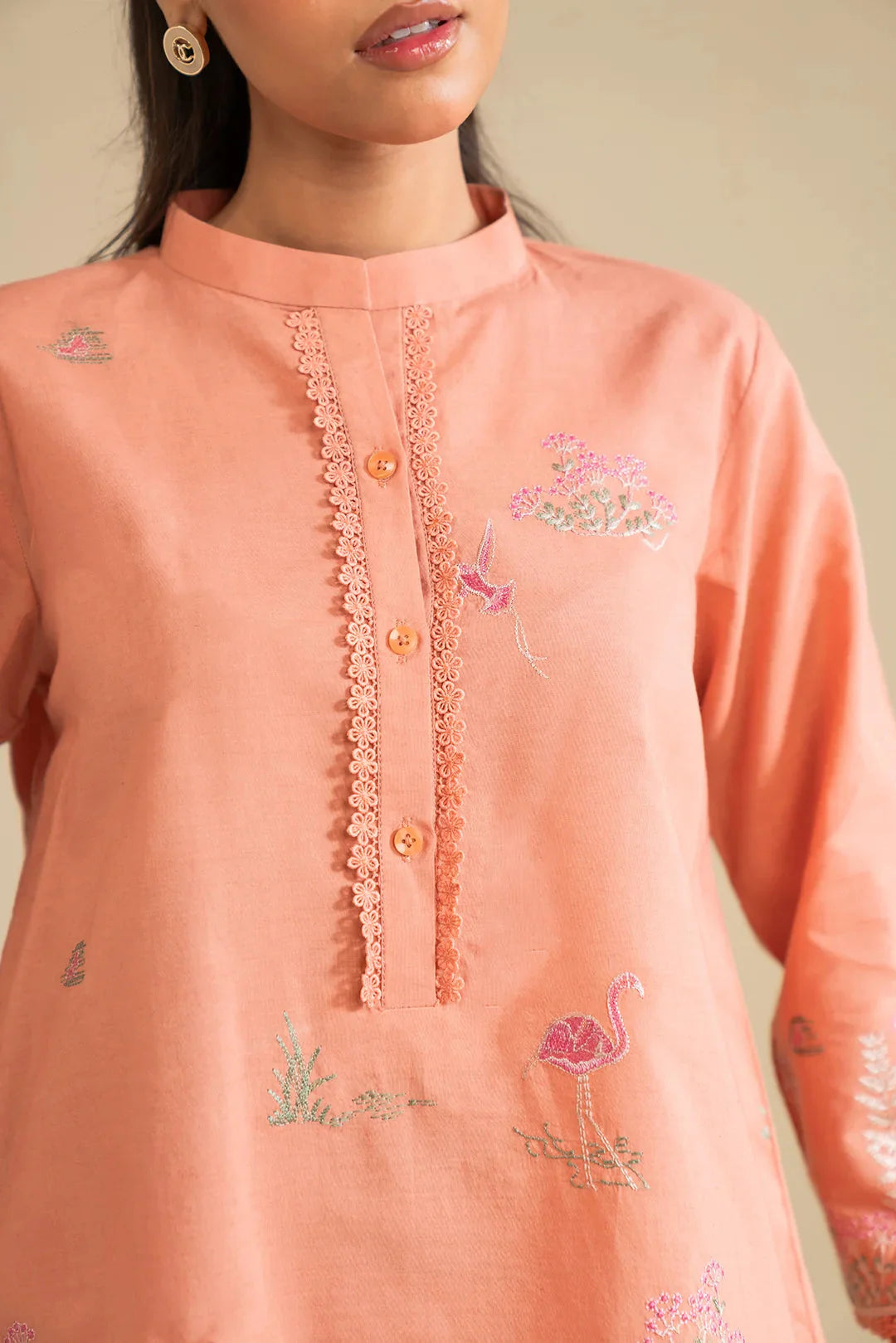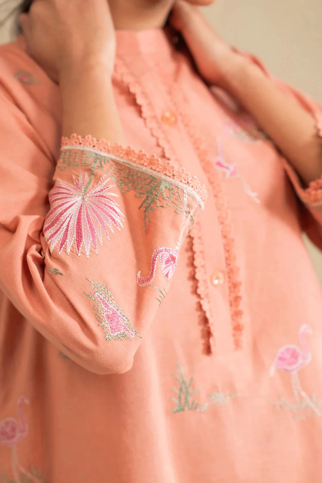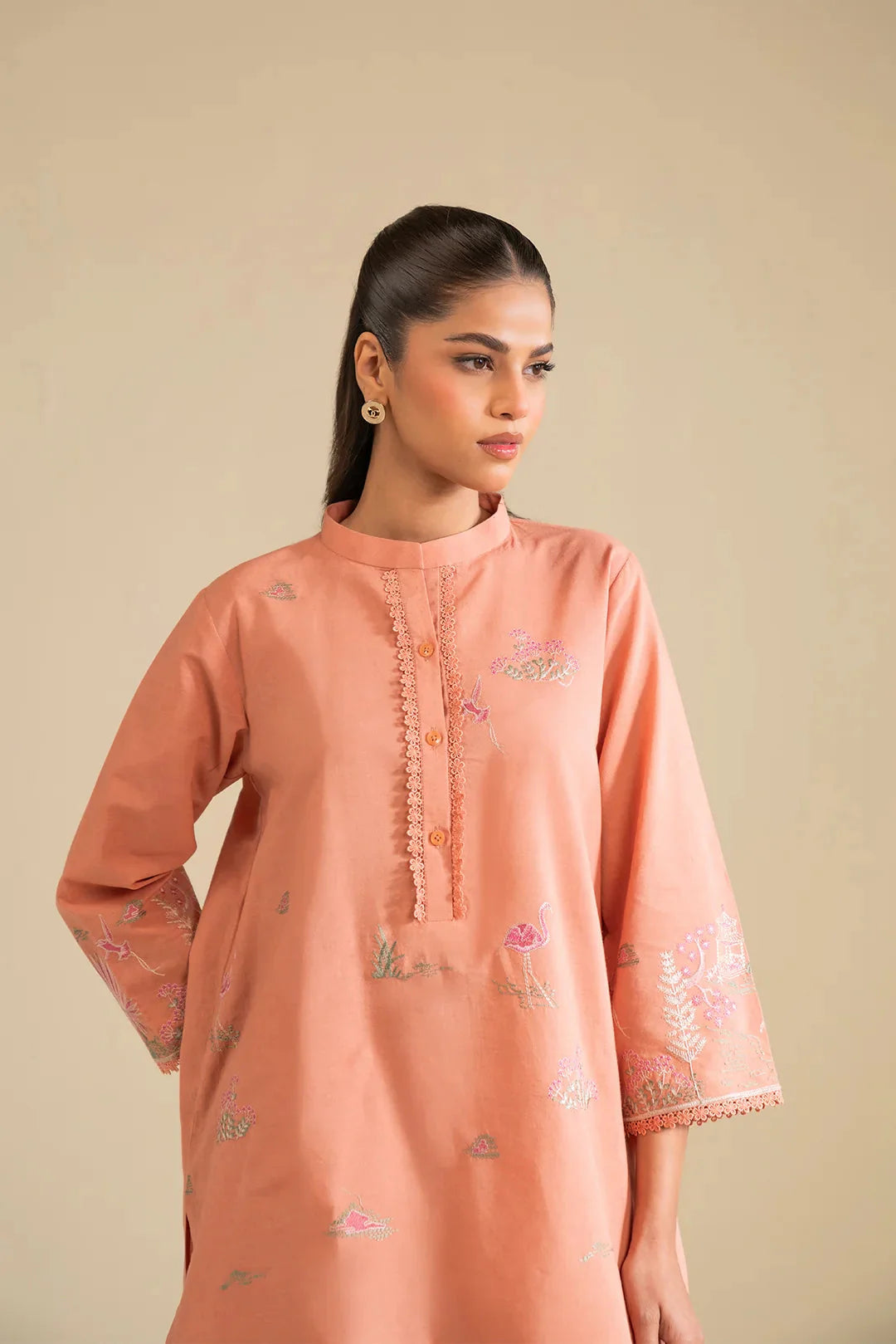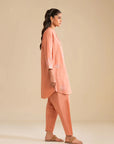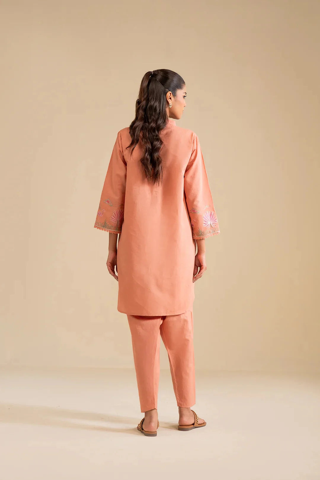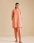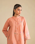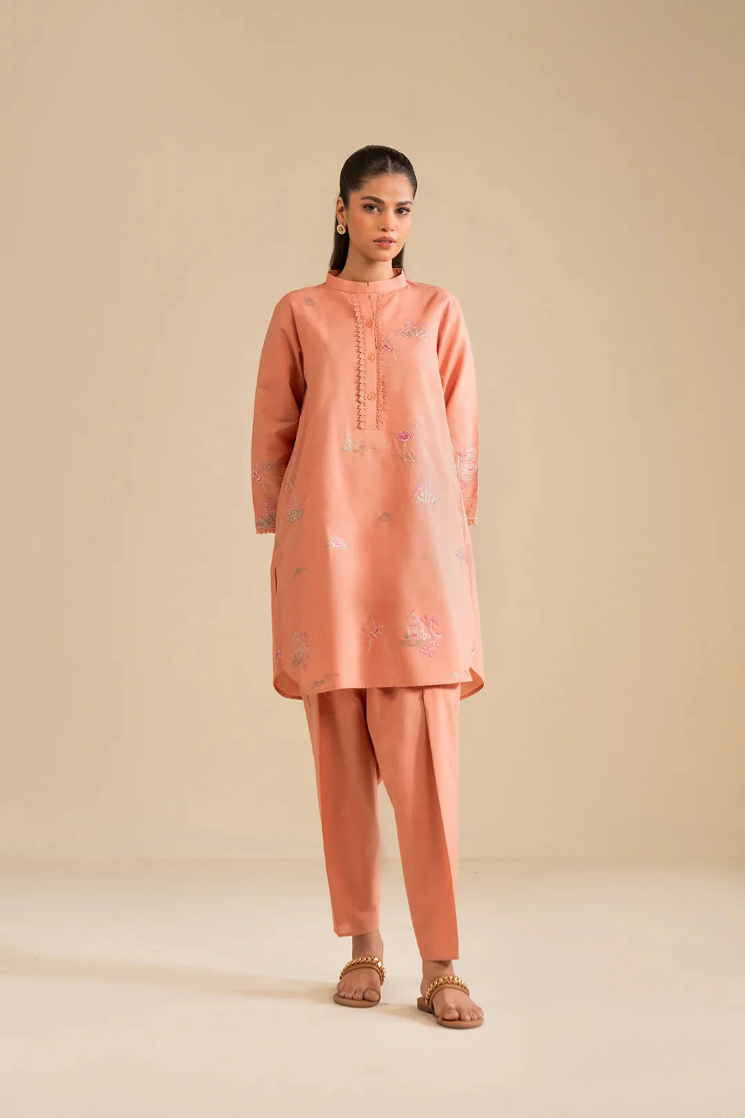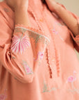 A graceful salmon peach two-piece lawn set featuring delicate embroidery on the shirt, paired with a stylish smart shalwar. Light, breathable, and effortlessly elegant—perfect for a chic yet comfortable look.