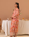 The ensemble features printed lawn suit, boasting vibrant hues paired with printed lawn dupatta and solid cambric trousers.