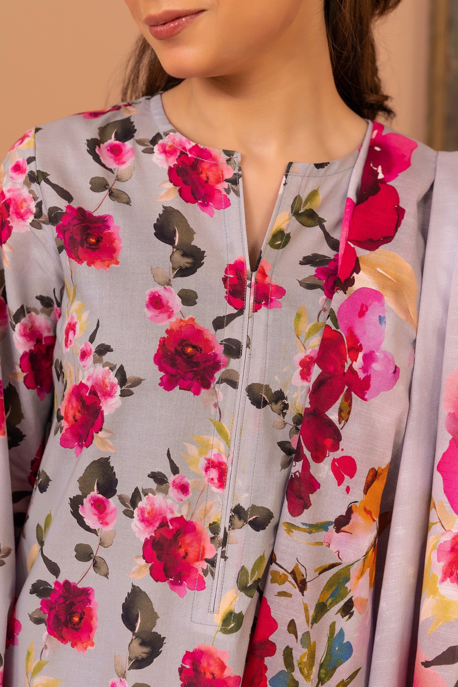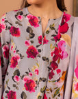 Indroducing our soothing grey printed suit adorned with colorful vibrant flowers paired by solif cambric trouser and slub dupatta.