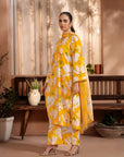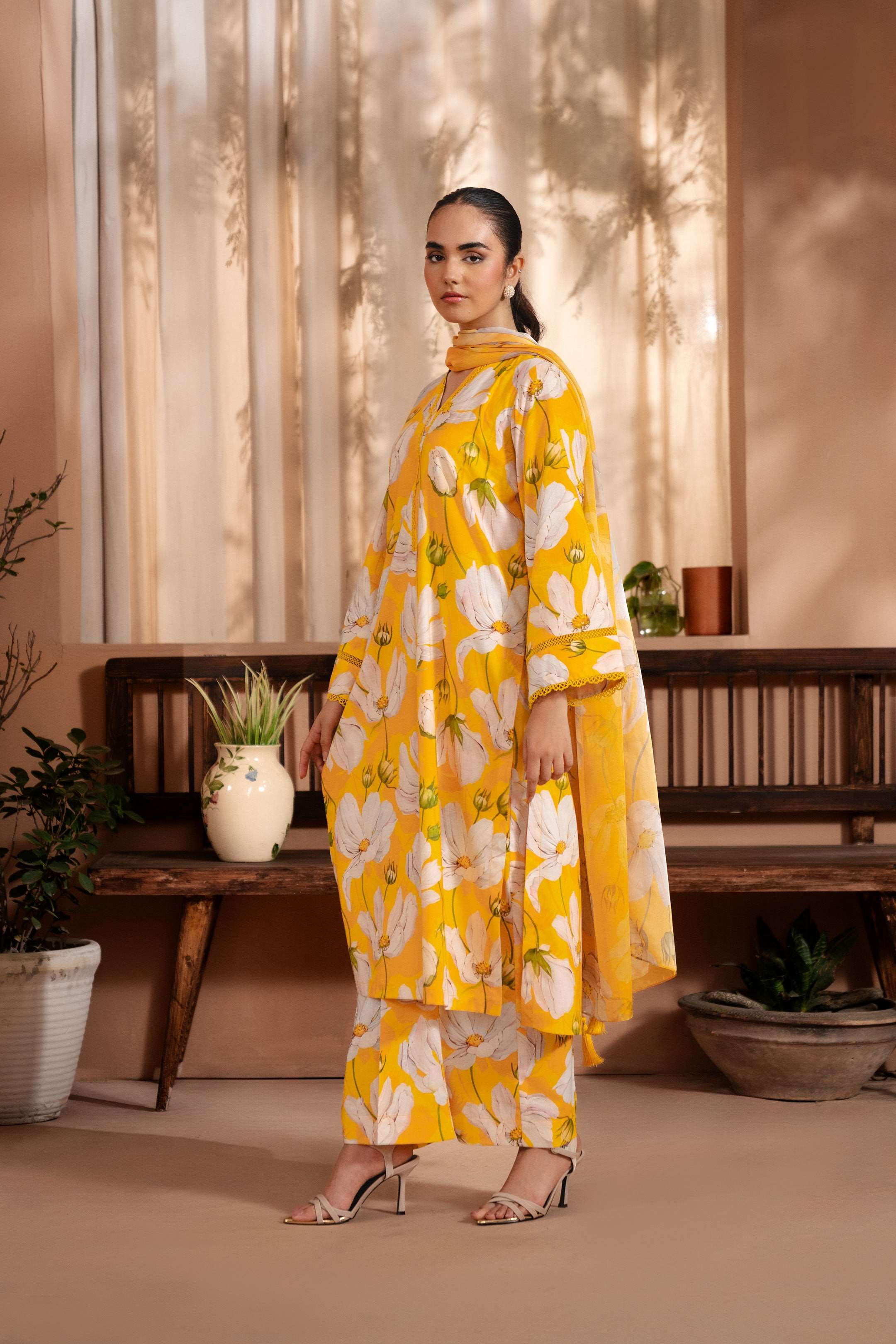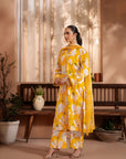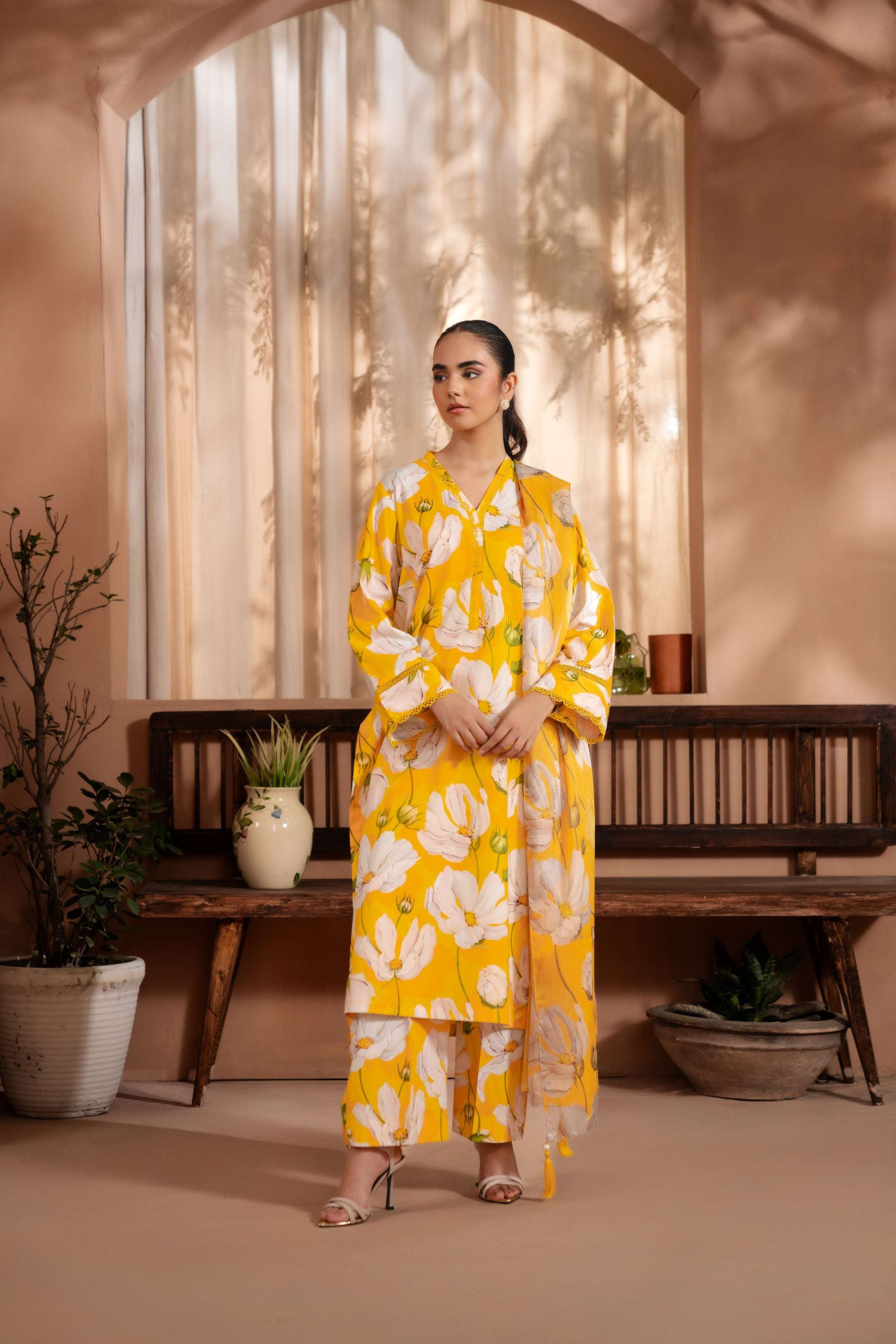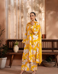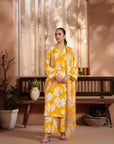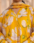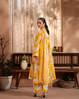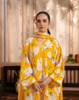 This subtle yellow floral printed 2-piece with flowy monark dupatta, adding a light to the ensemble.