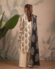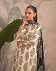 A beautifully printed lawn suit featuring traditional paisley patterns, paired with a matching cambric trouser and a contrasting black voile dupatta. A perfect blend of sophistication and comfort.