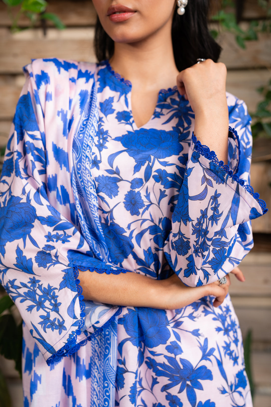 Stay cool and classy this summer with this breezy lawn suit. The printed lawn shirt adds a touch of charm, while the soft dyed cambric trouser offers all-day comfort. Paired with a flowy printed voile dupatta, this outfit is perfect for casual summer days and get-togethers.