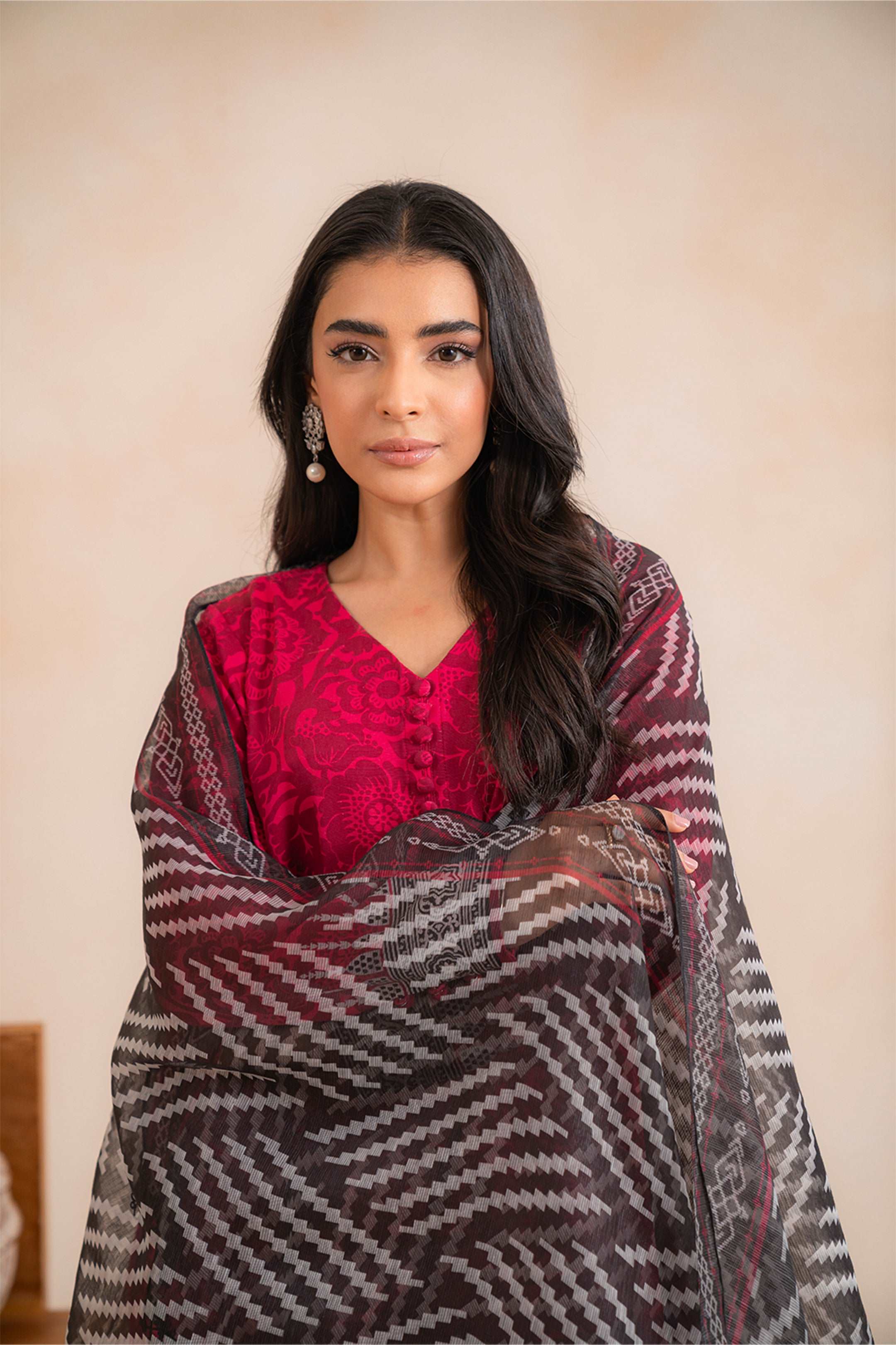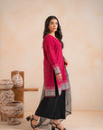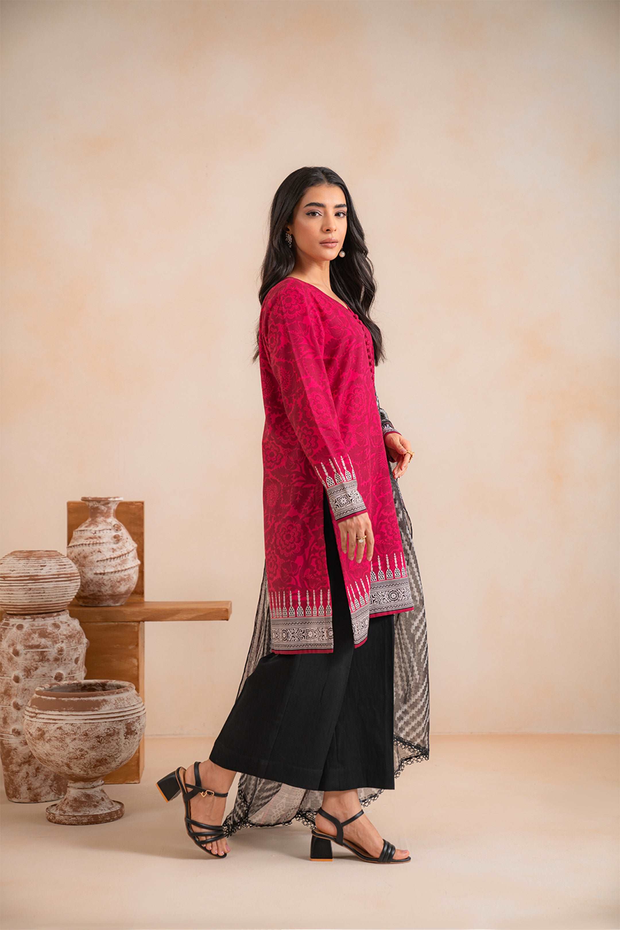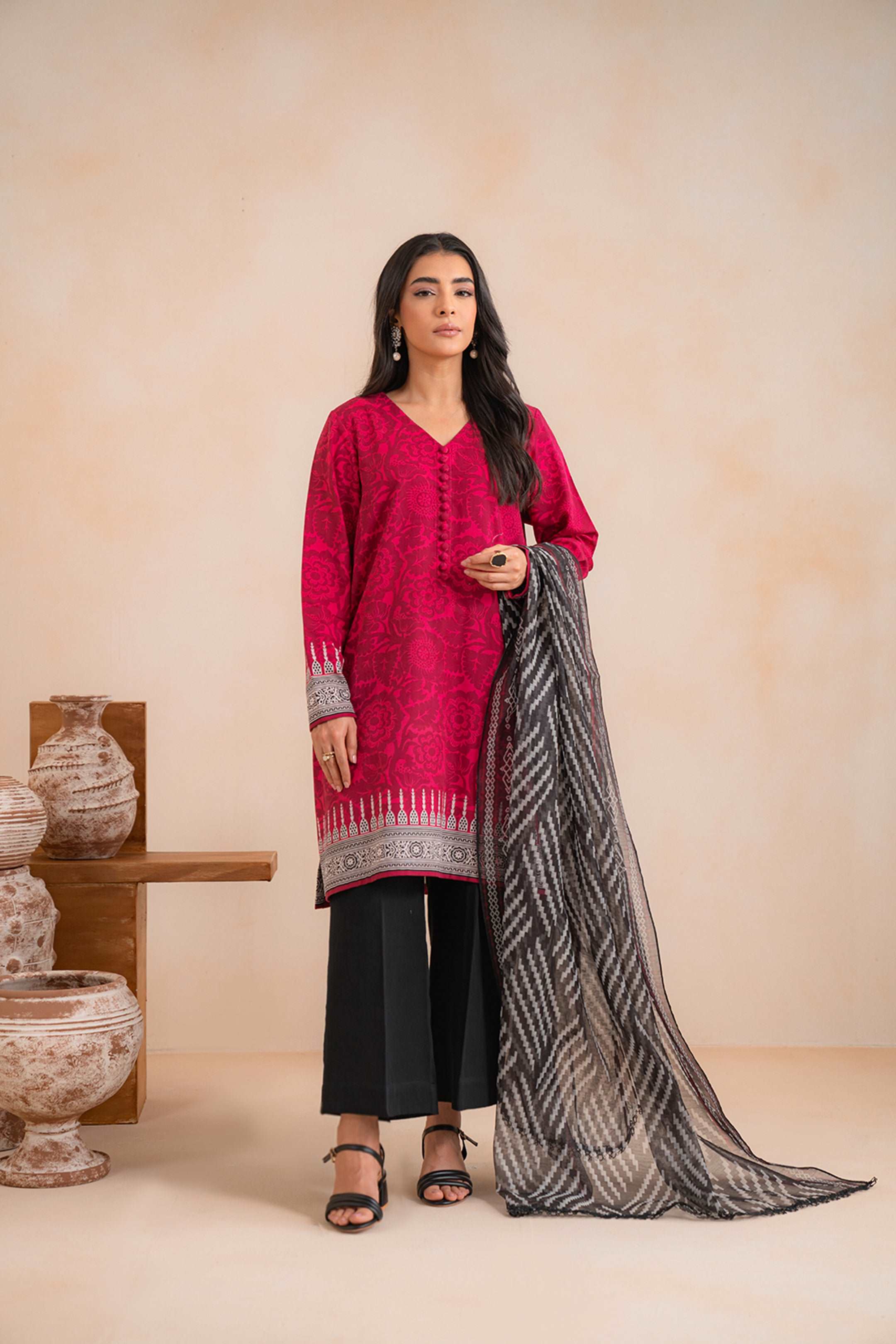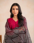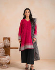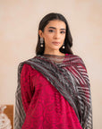 Capture attention with this blush pink harmony unstitced suit, featuring captivating bold prints on soft khaddar fabric. A timeless charm -your wardrobe essential.