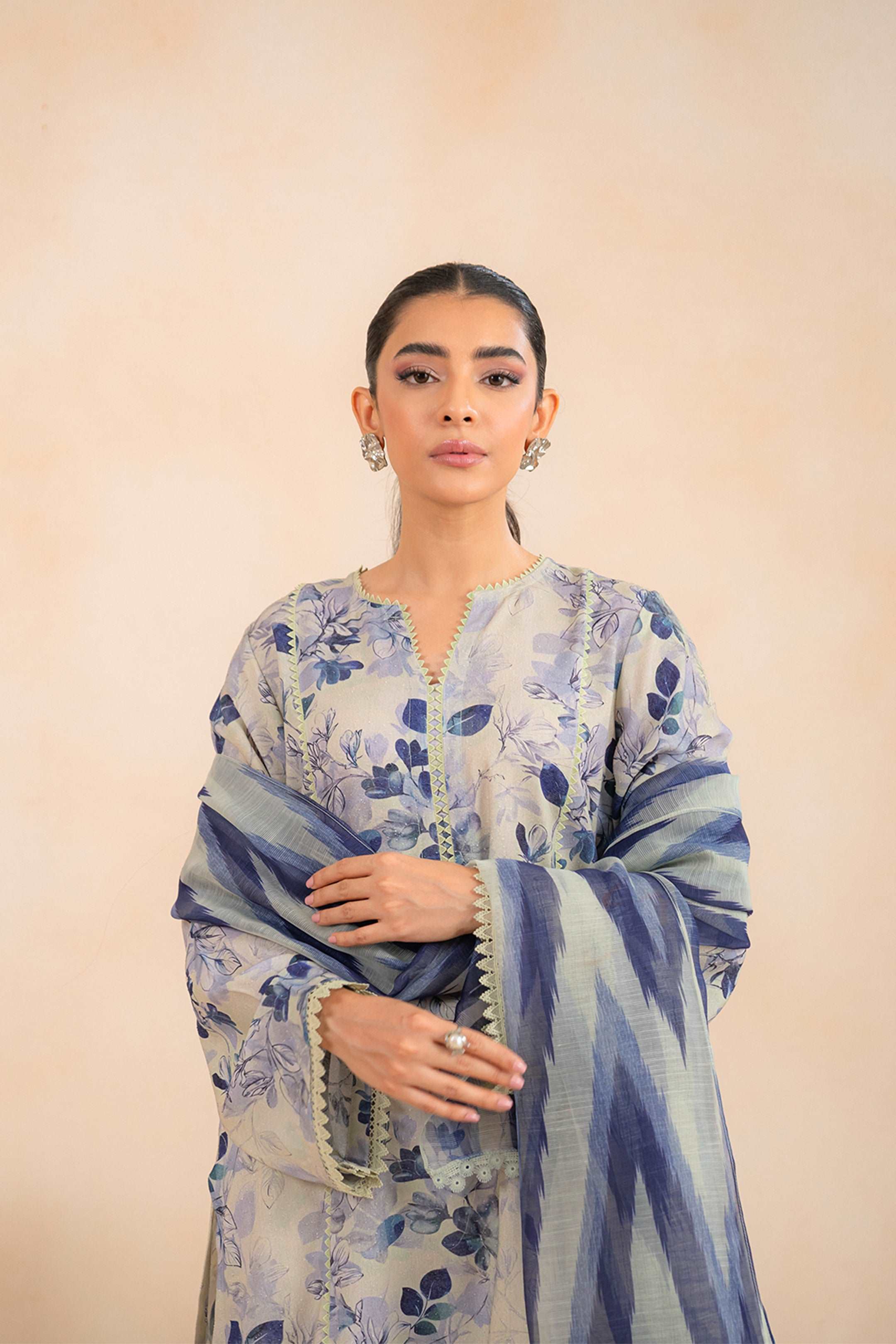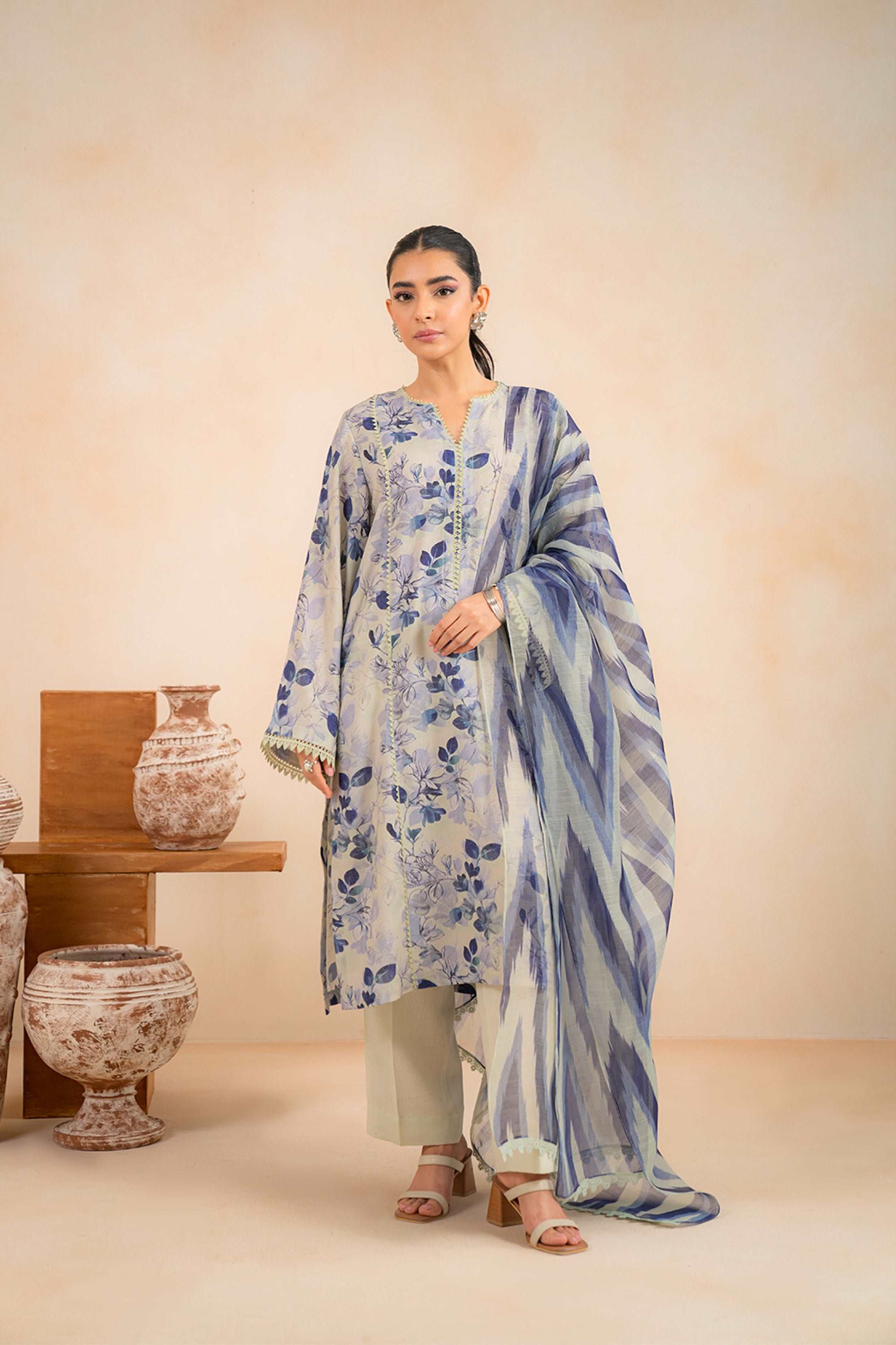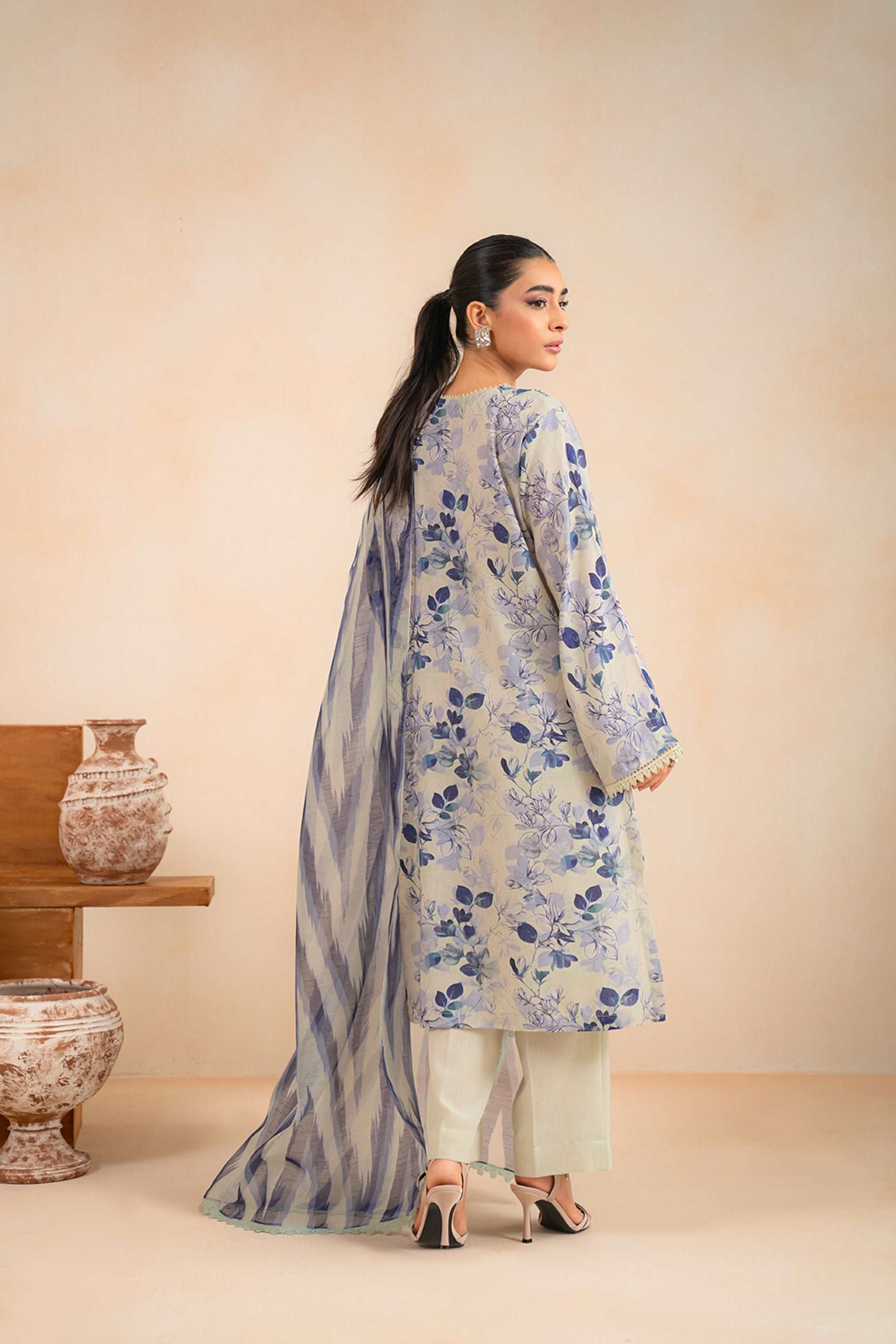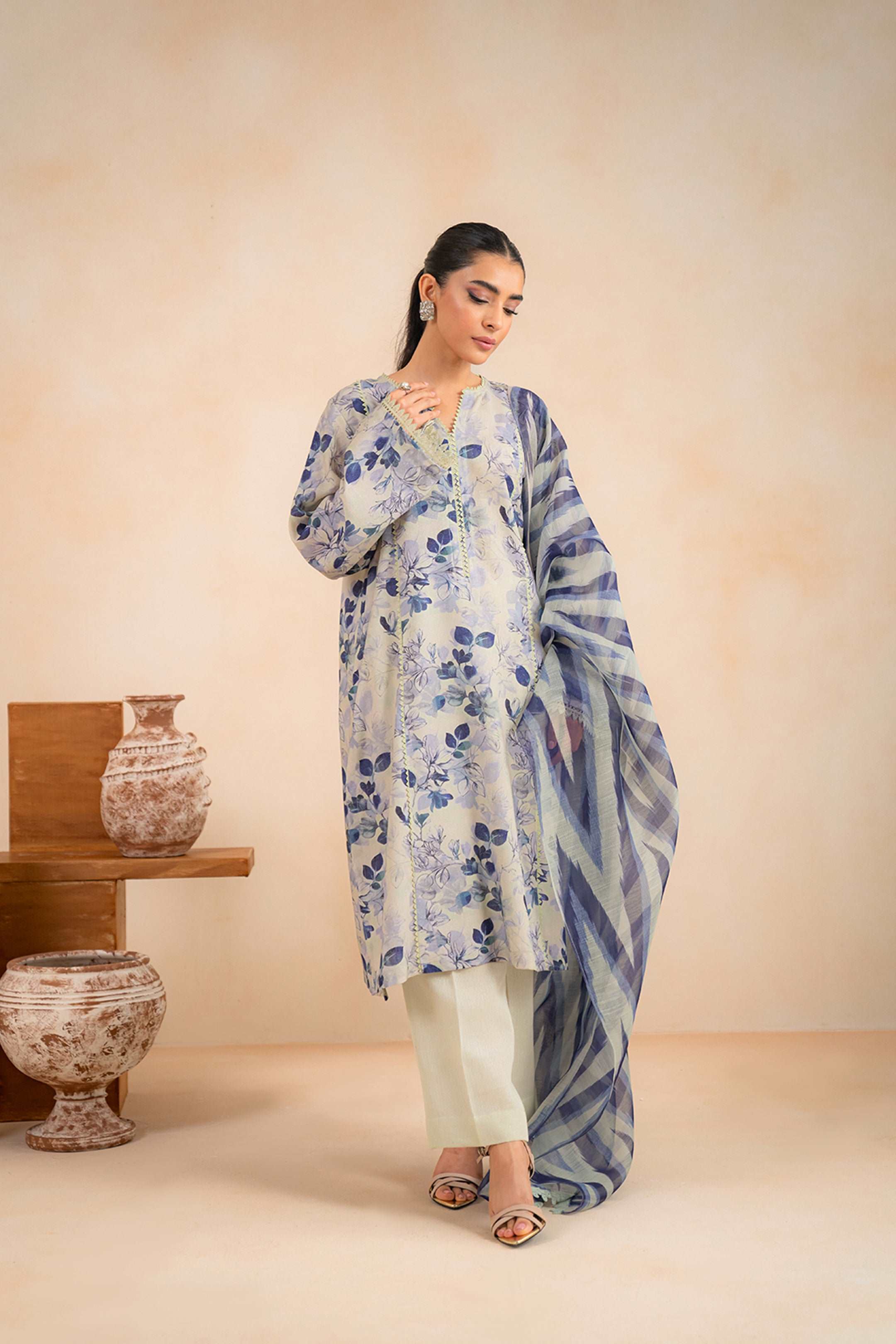Make a statement in this beige 3 piece printed suit with eye-catching digital prints includes shirt, dupatta with basic dyed trouser gives a whole vibrant style.Soft karandi fabric ensures comfort and style for any occasion