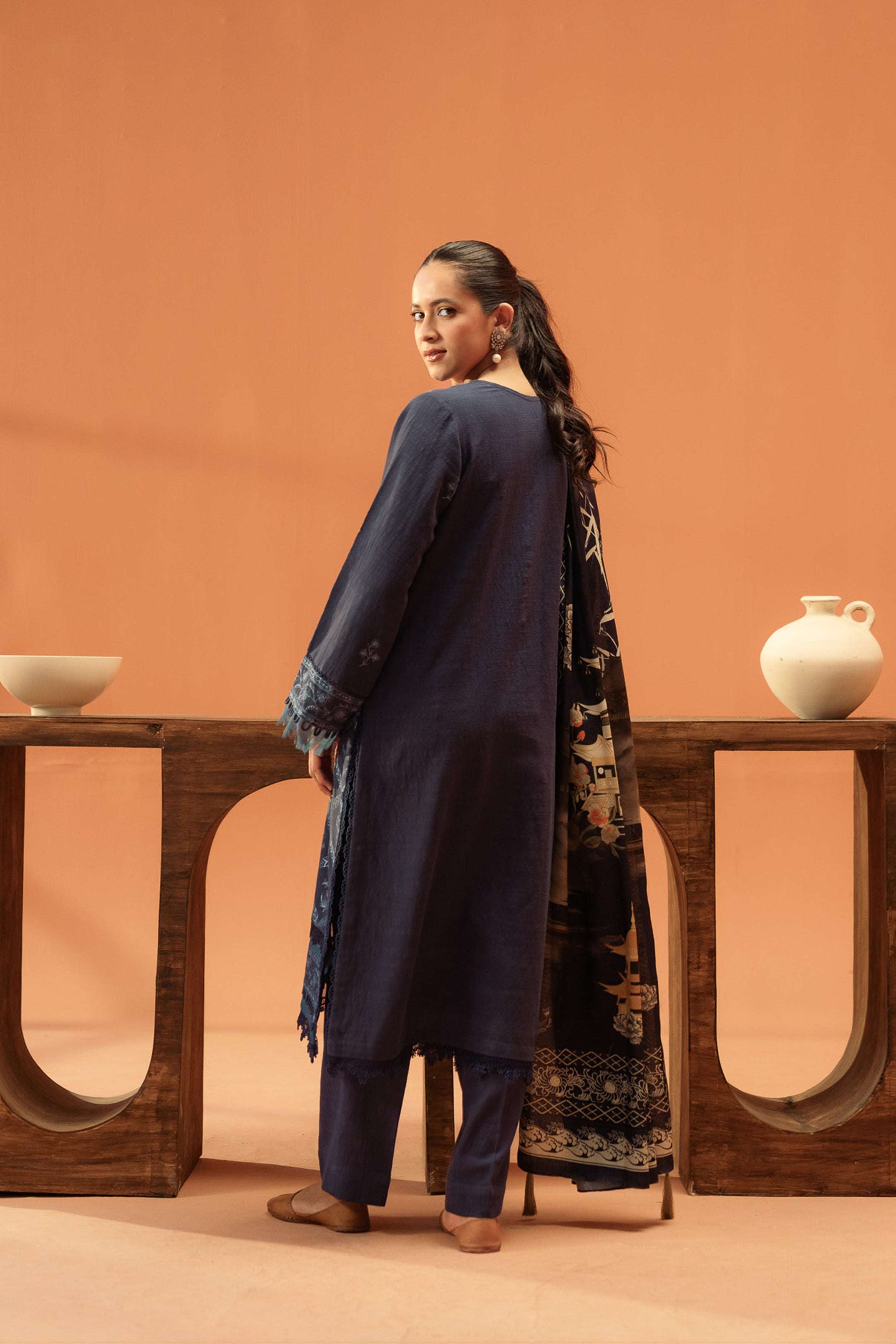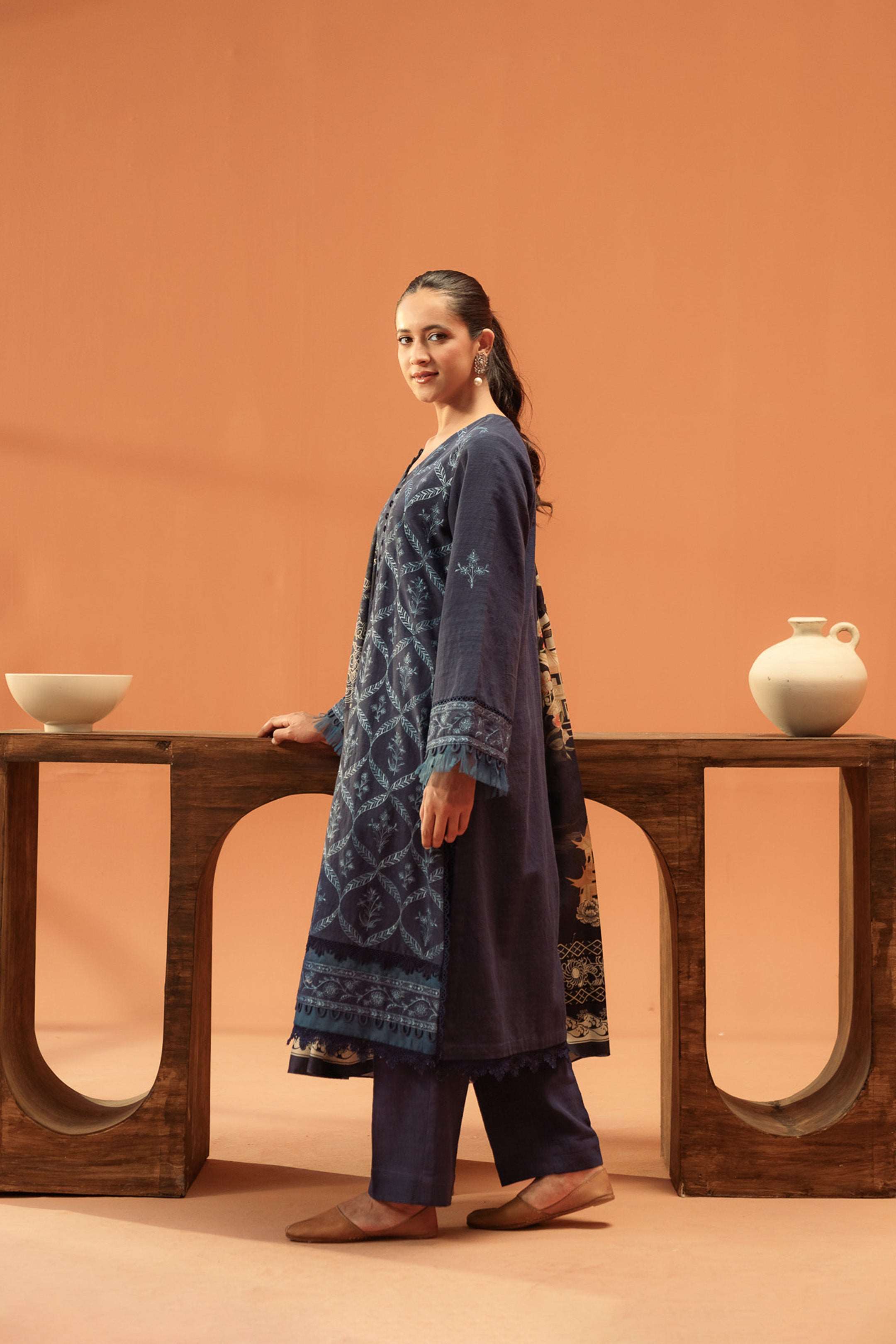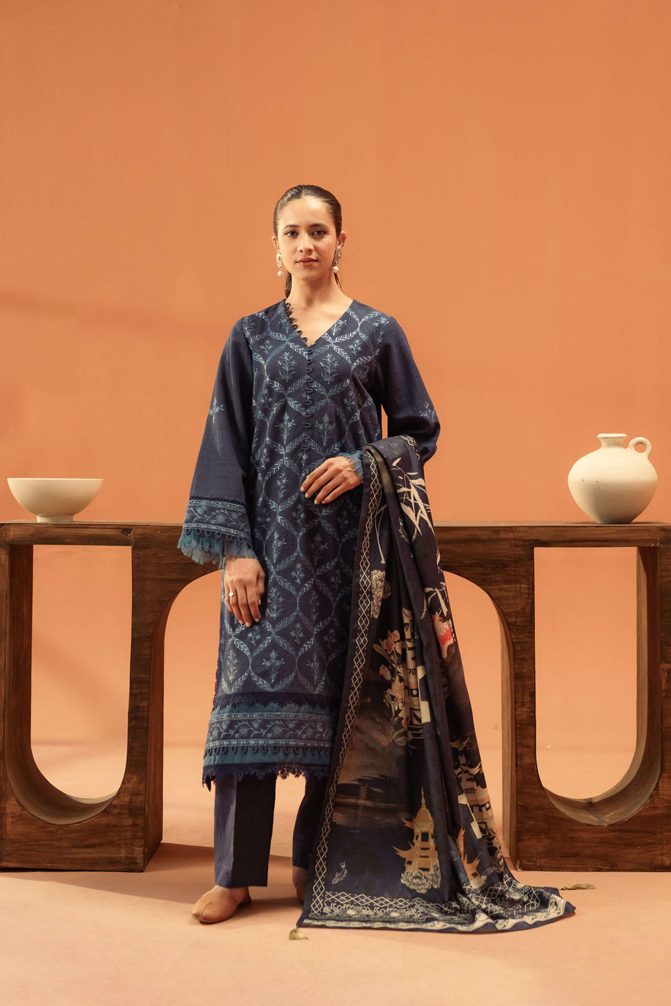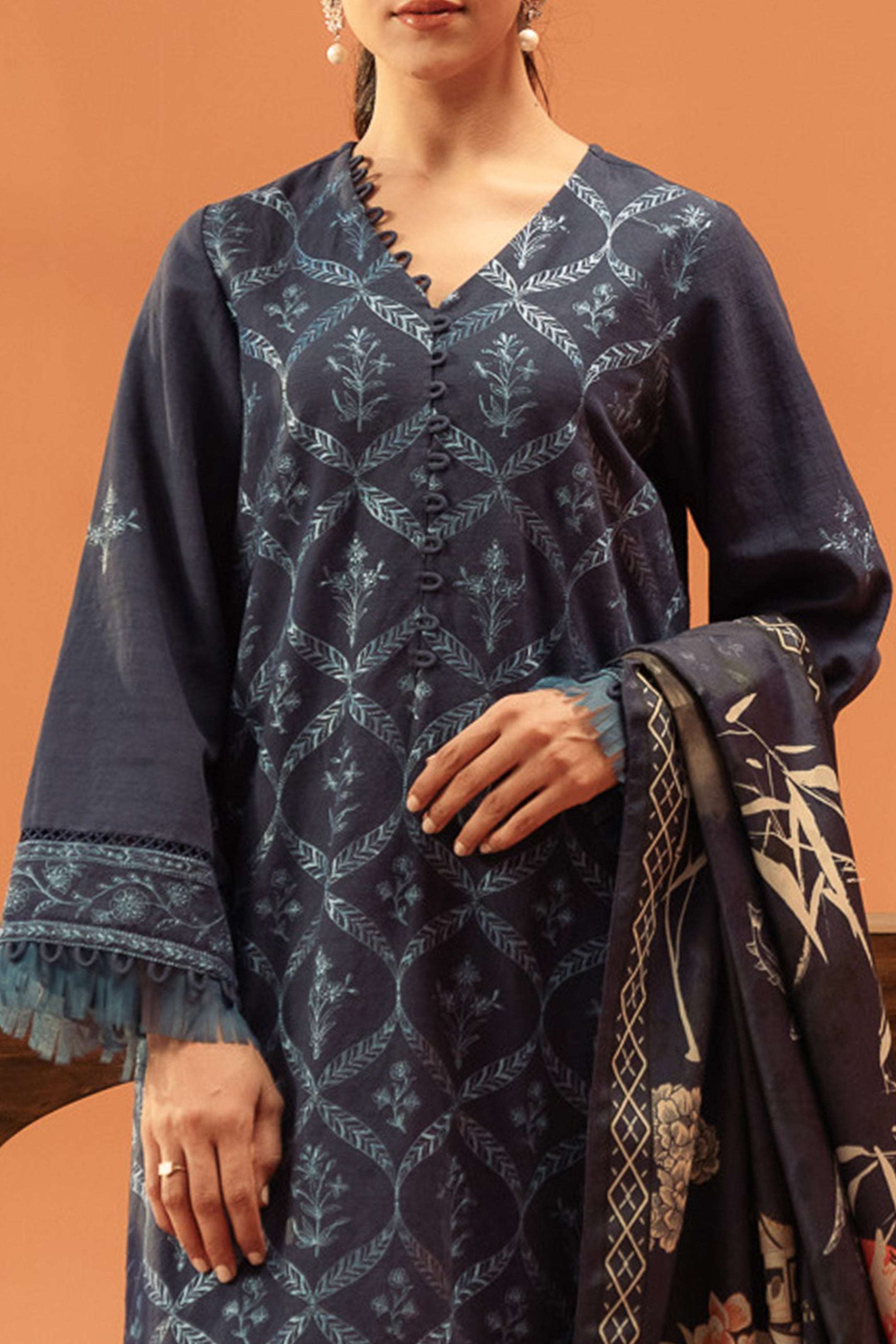 Sapphire blue khaddar suit with floral embellishments, making it stand out in all your winter outfits.