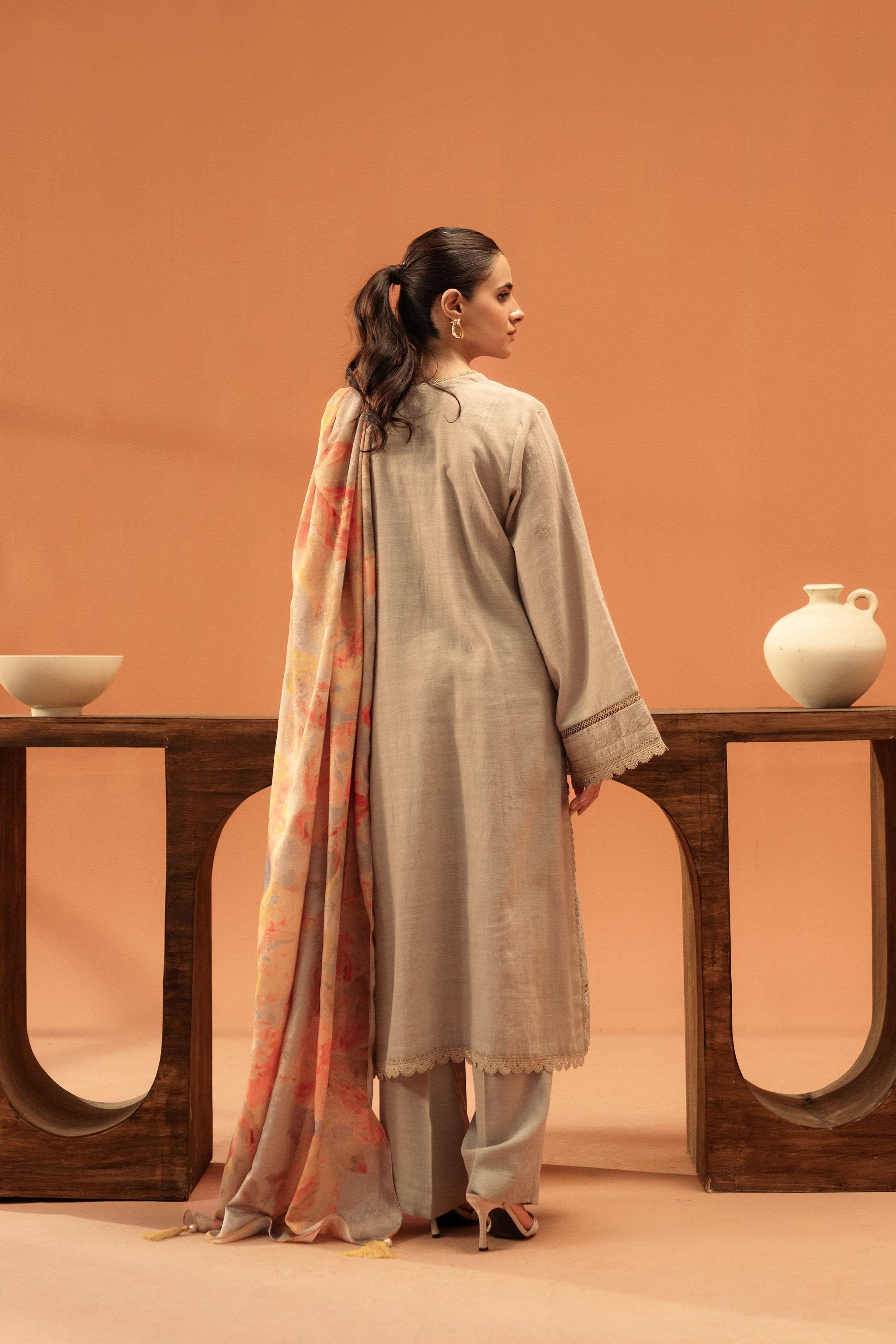 Beige khaddar suit adorned with deliacte embroidery, complimented with beautifully gathered floral printed jacquard shawl.