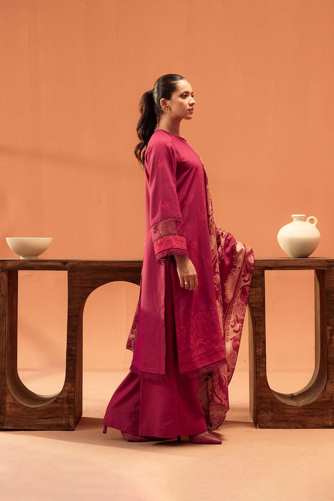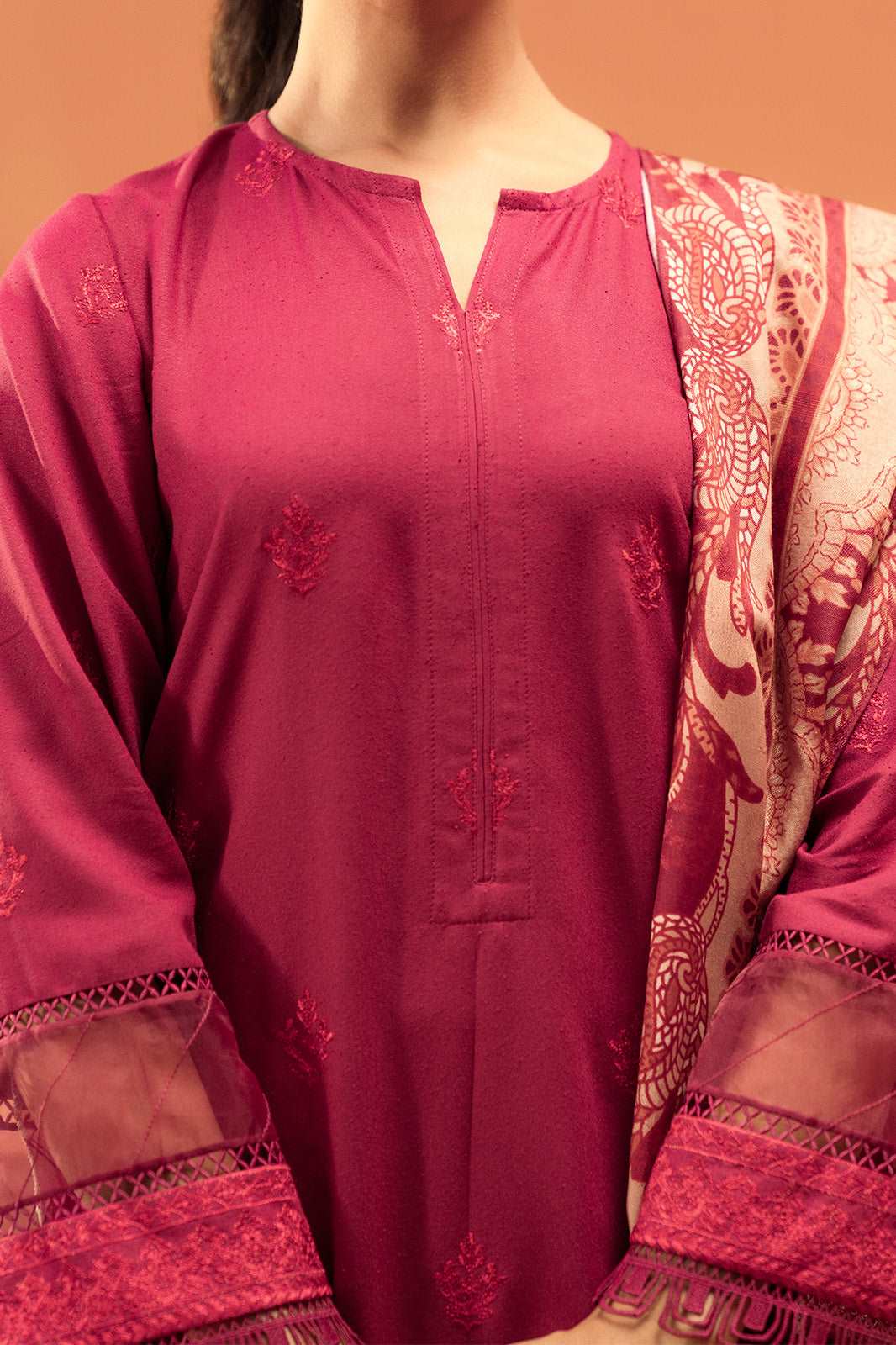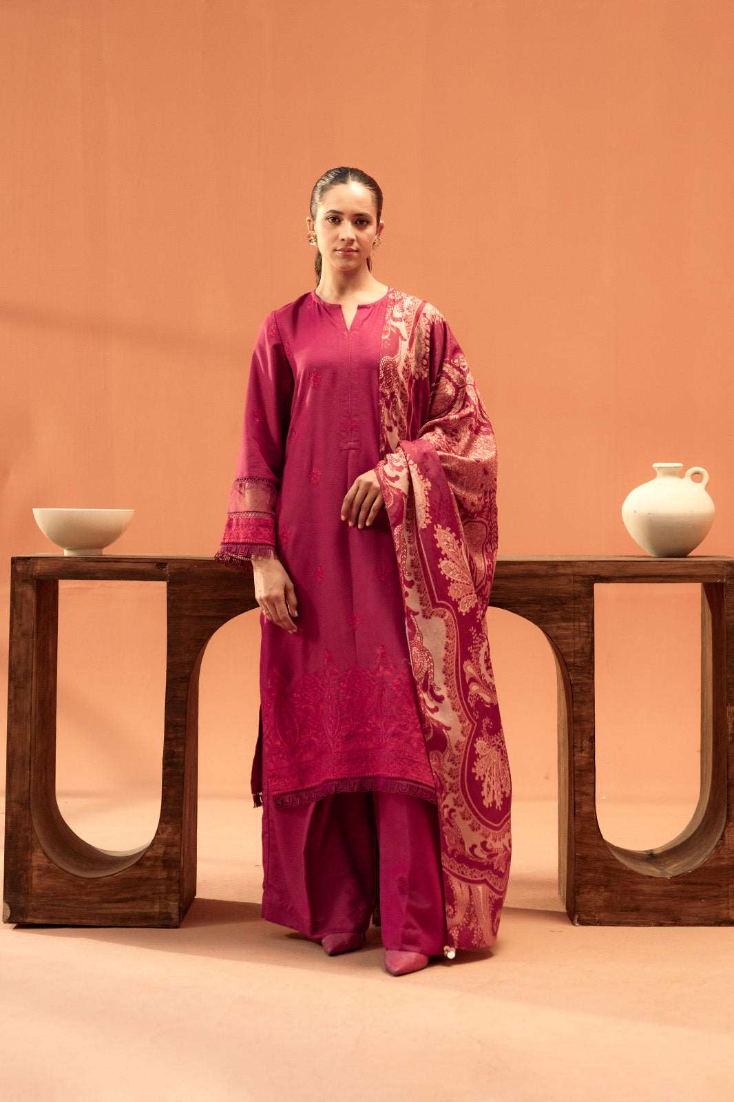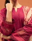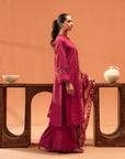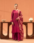 A beautifully tailored plum karandi suit featuring exquisite threadwork, creating a timeless statement of elegance.