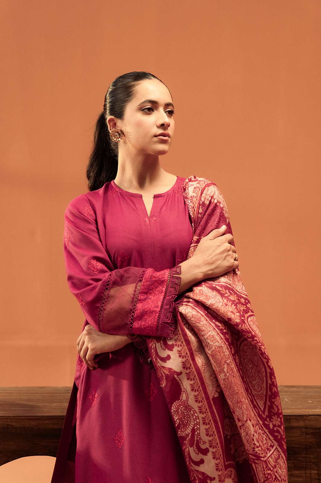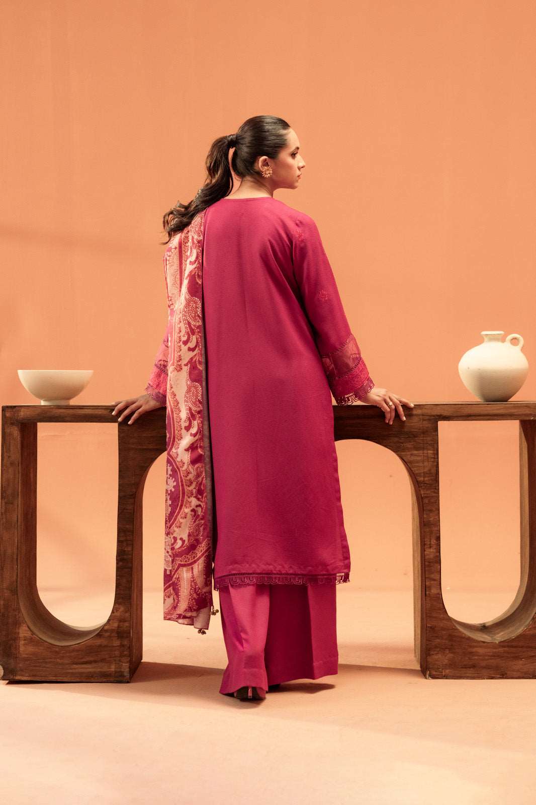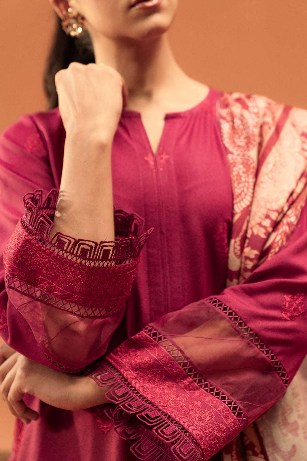 A beautifully tailored plum karandi suit featuring exquisite threadwork, creating a timeless statement of elegance.