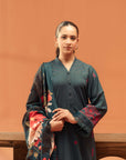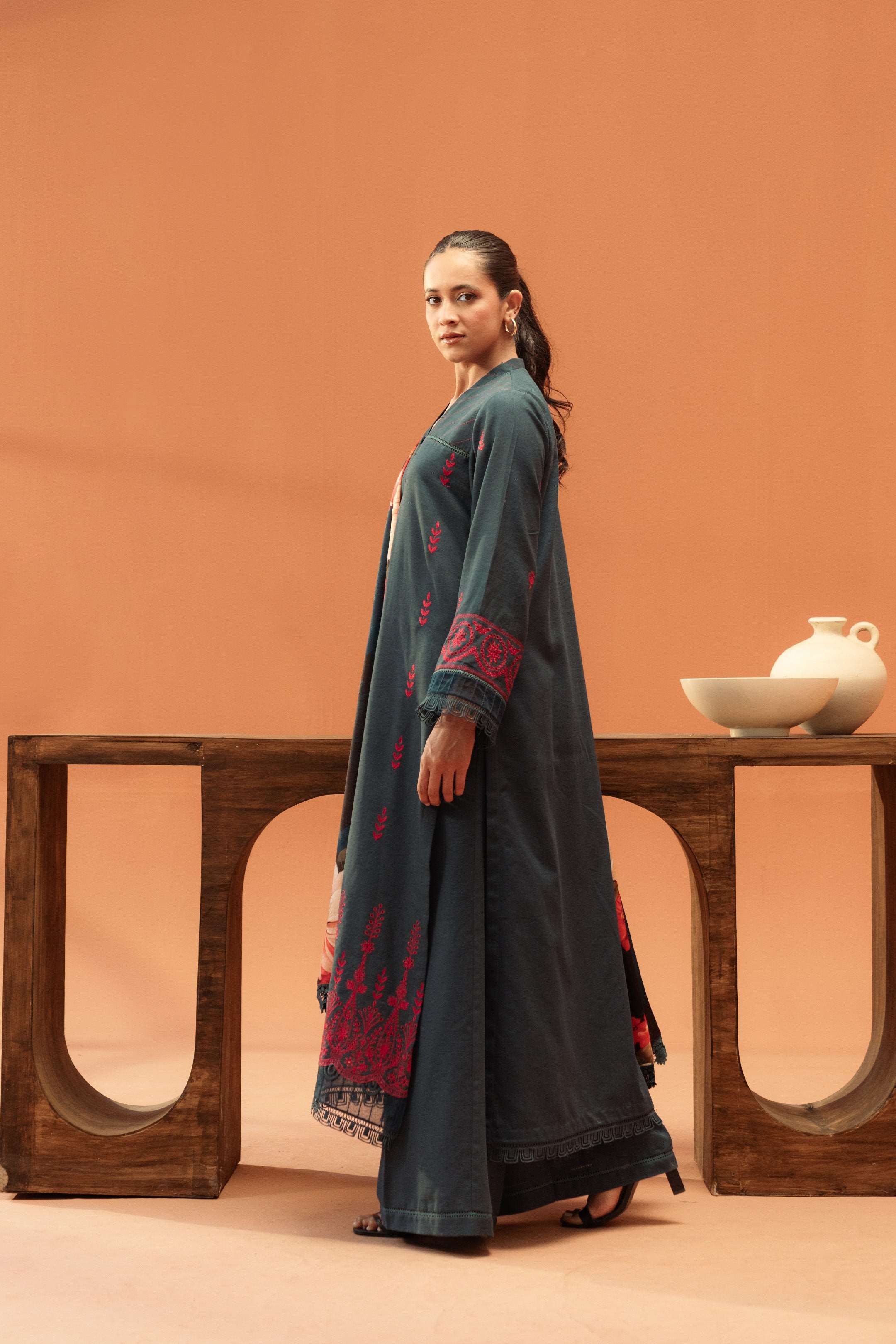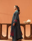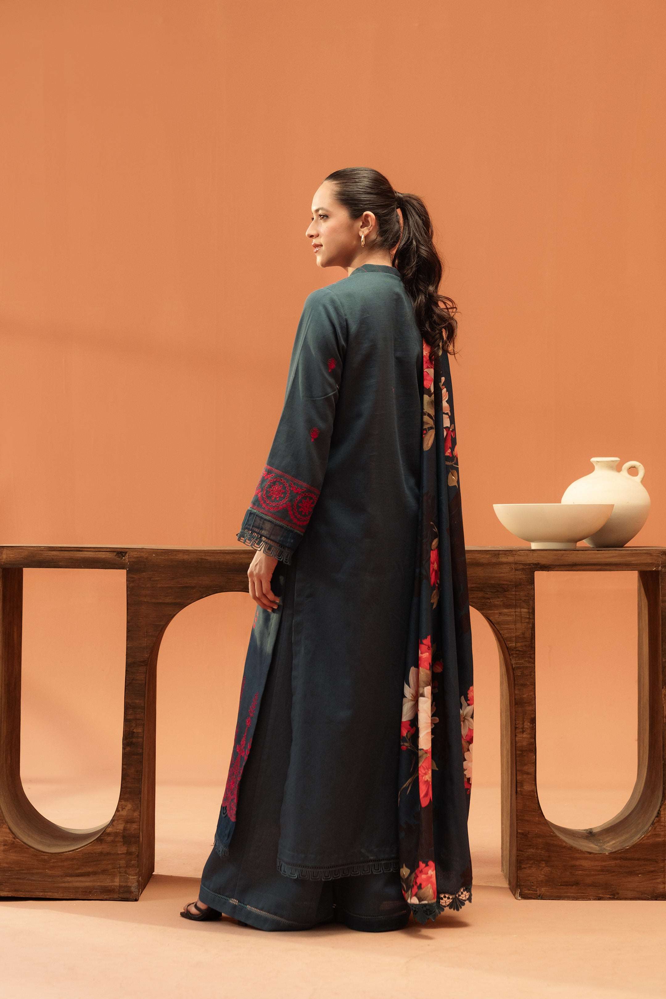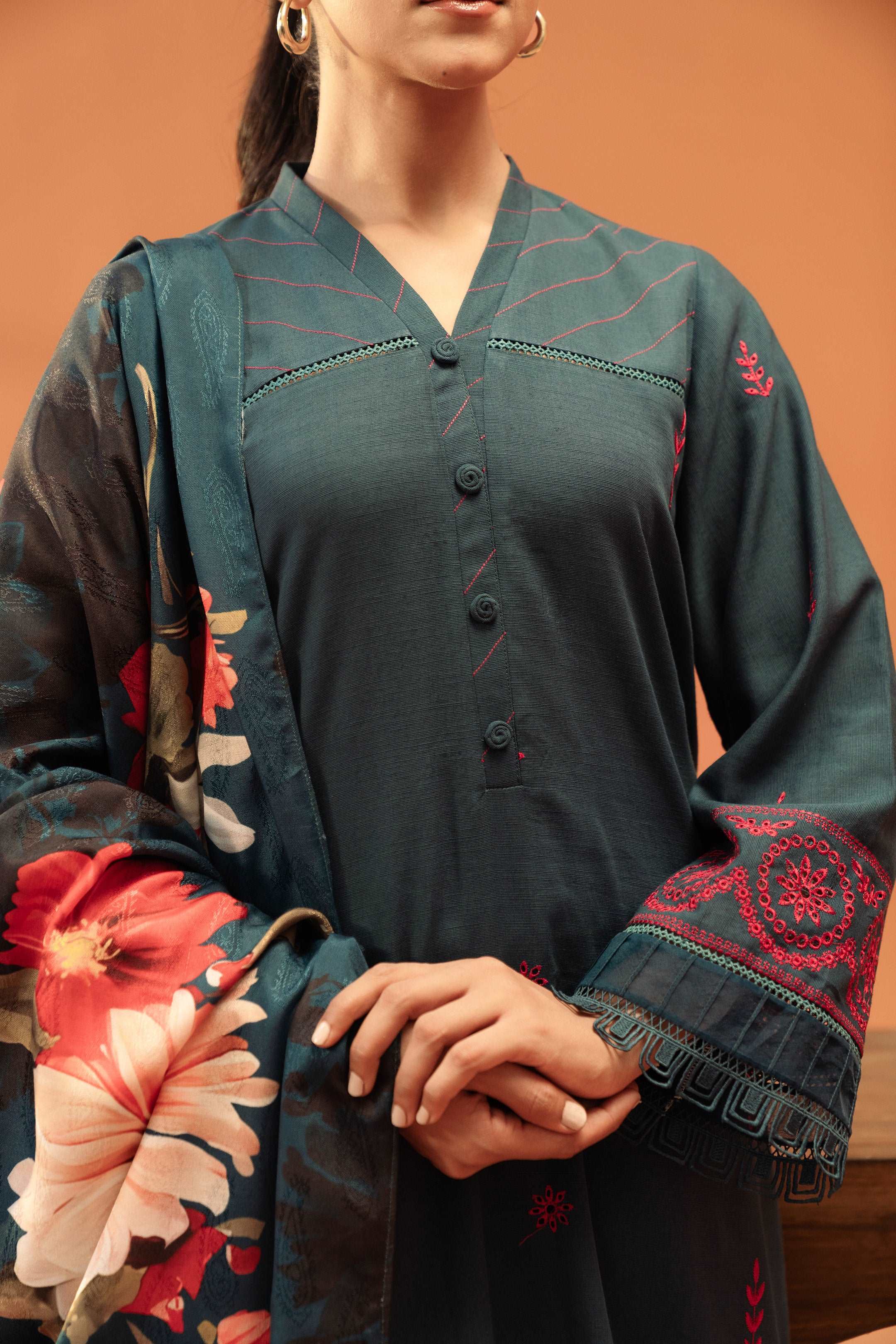 The beautiful teal khaddar suit with intricate pink blush details, makes it a perfect fit for all your evening occasions.
