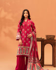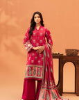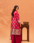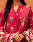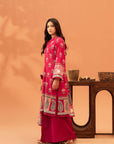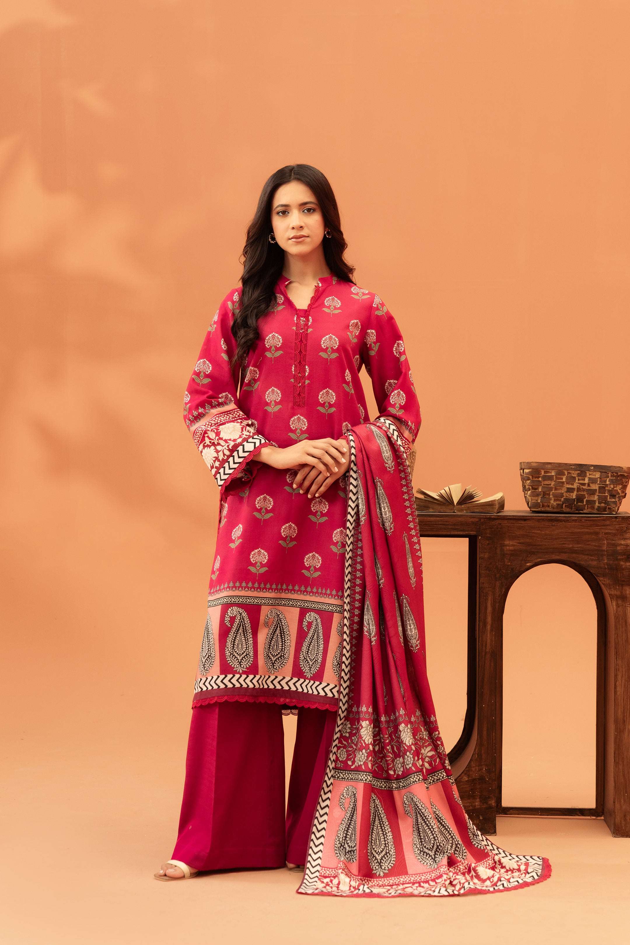 A rich pink khadar suit adorned with intricate beige prints , adding a luxurious touch to the fit.
