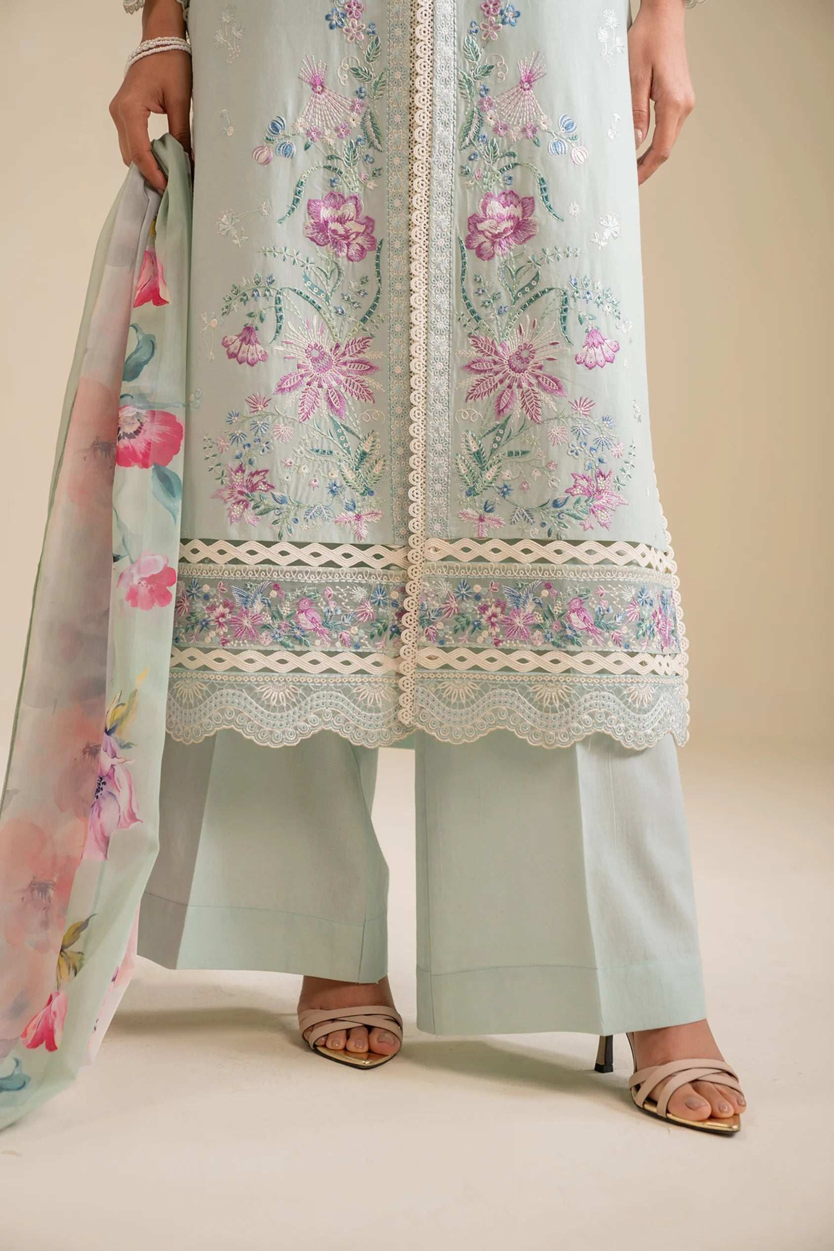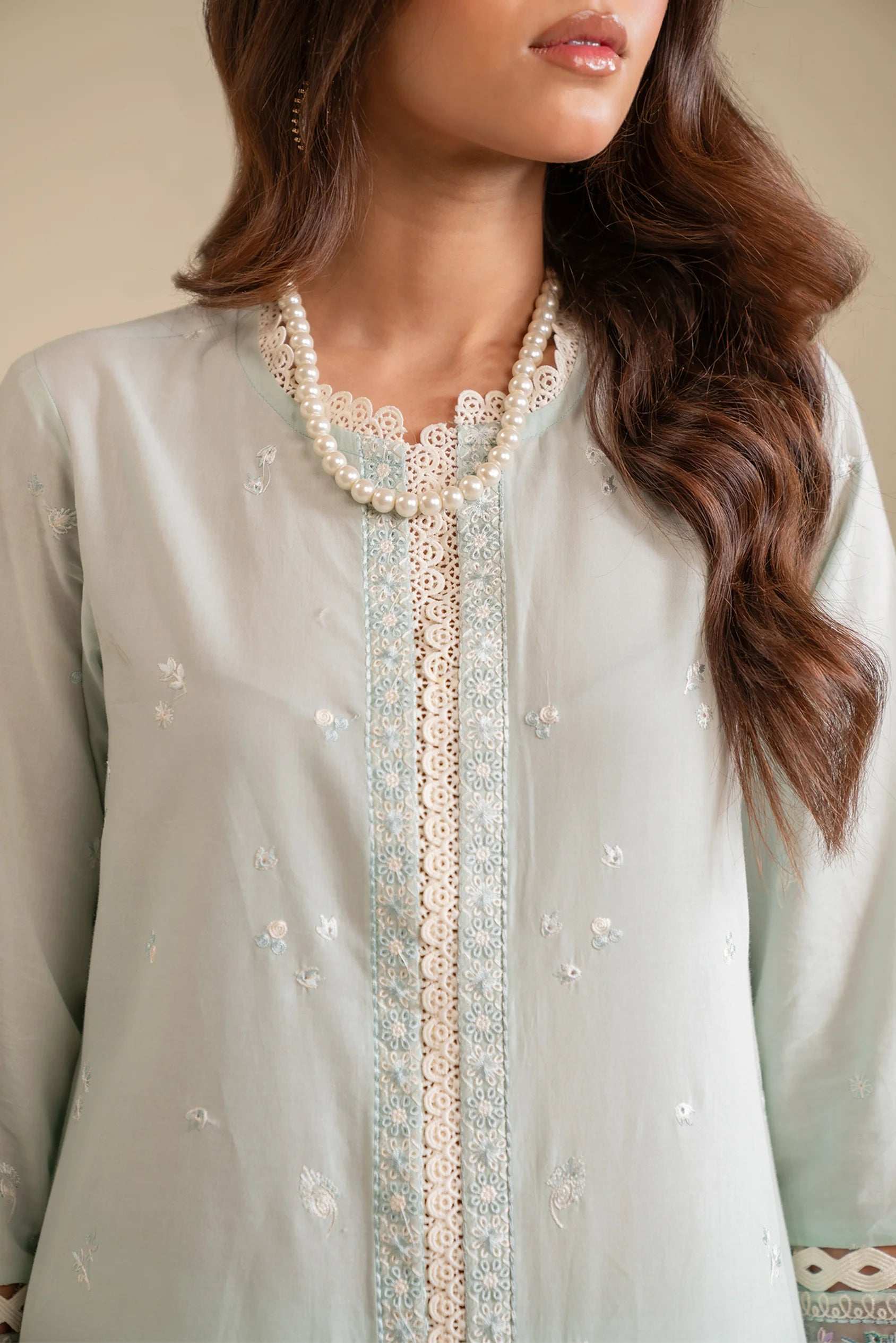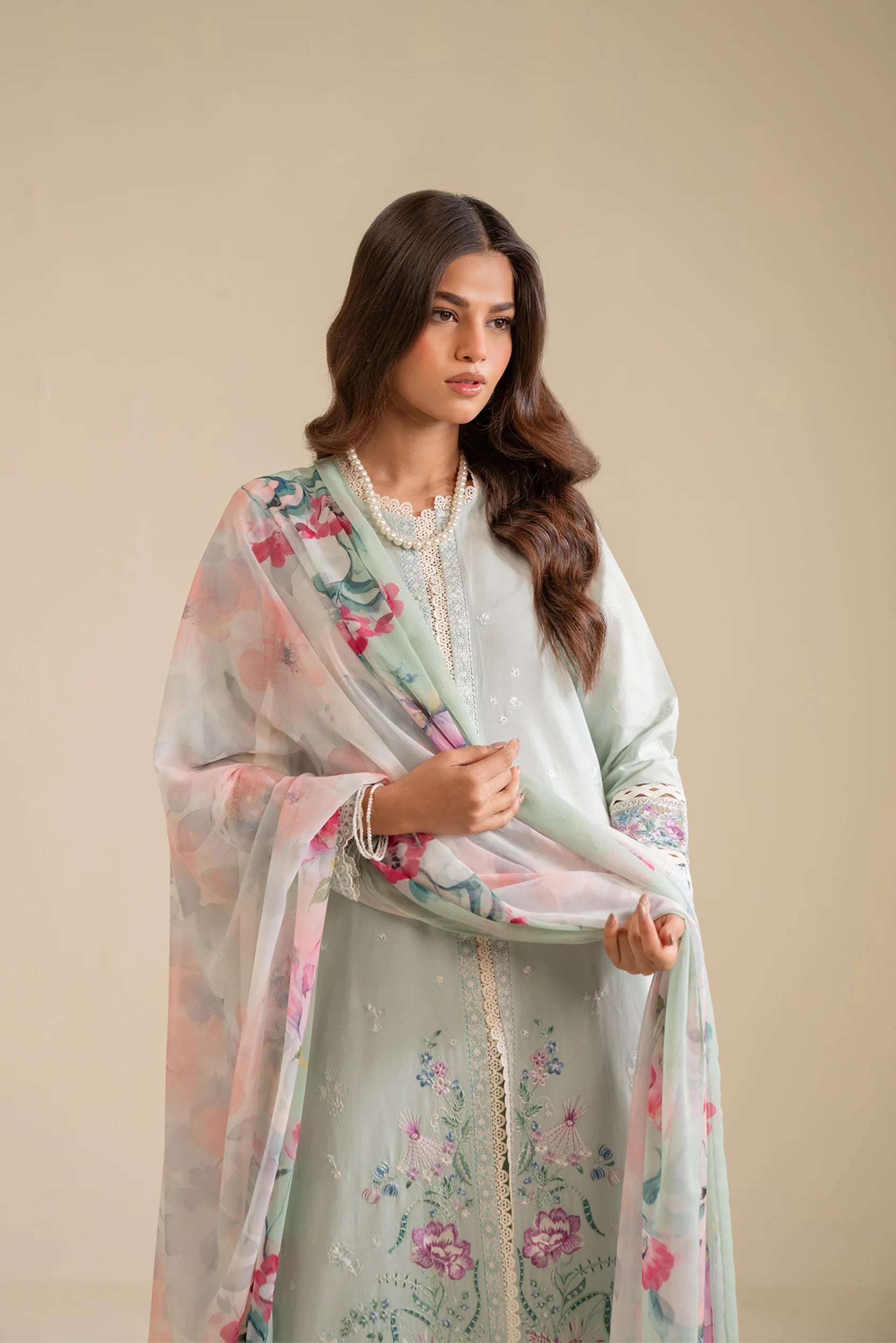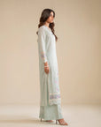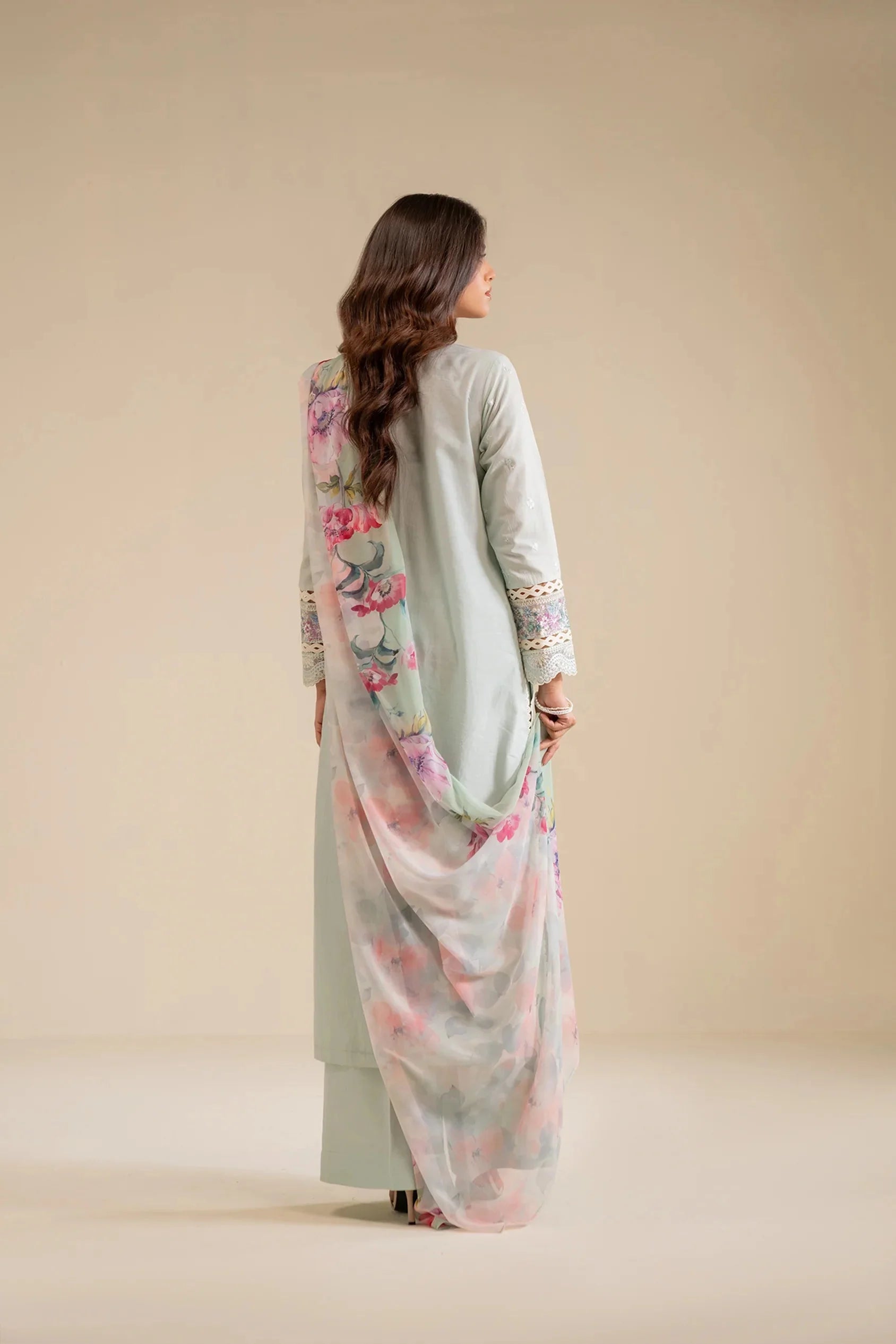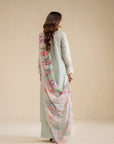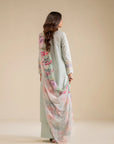 A very subtle celadon suit with minimal embroidery details and a perfect printed dupatta, a go-to fit for summers.