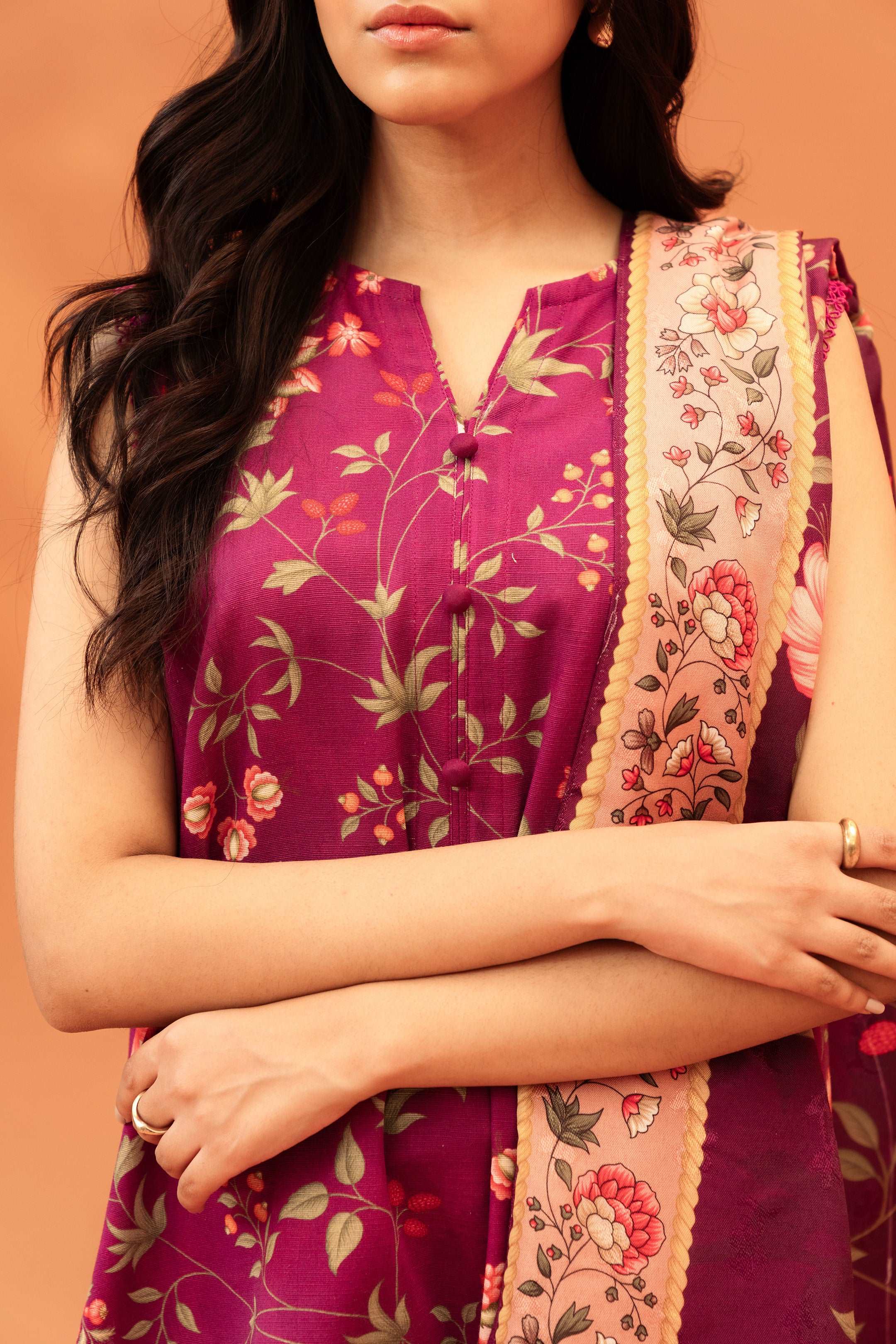 Add flair to your wardrobe with this plum khaddar 2 piece suit, featuring bold prints making it a perfect attire.