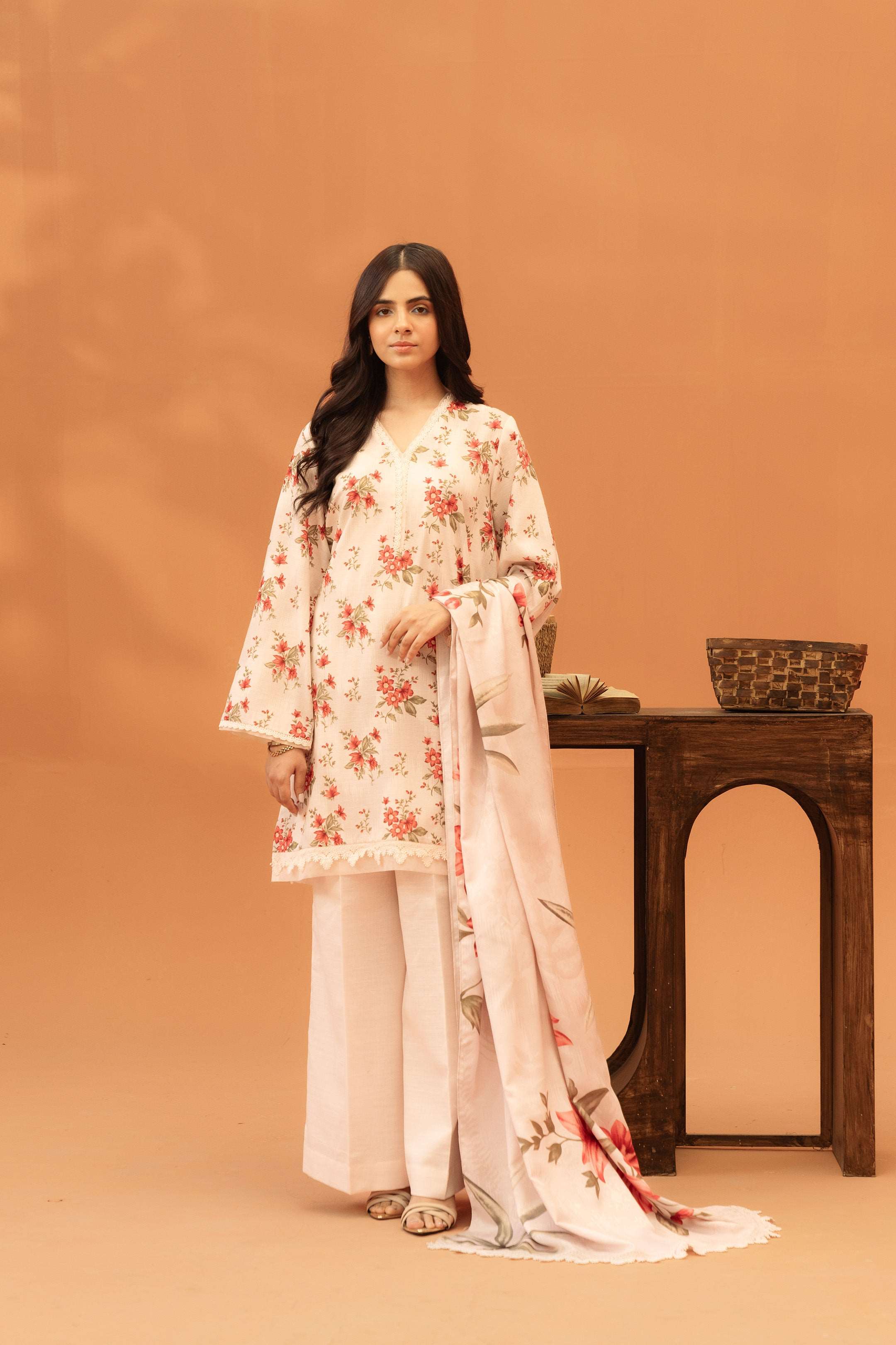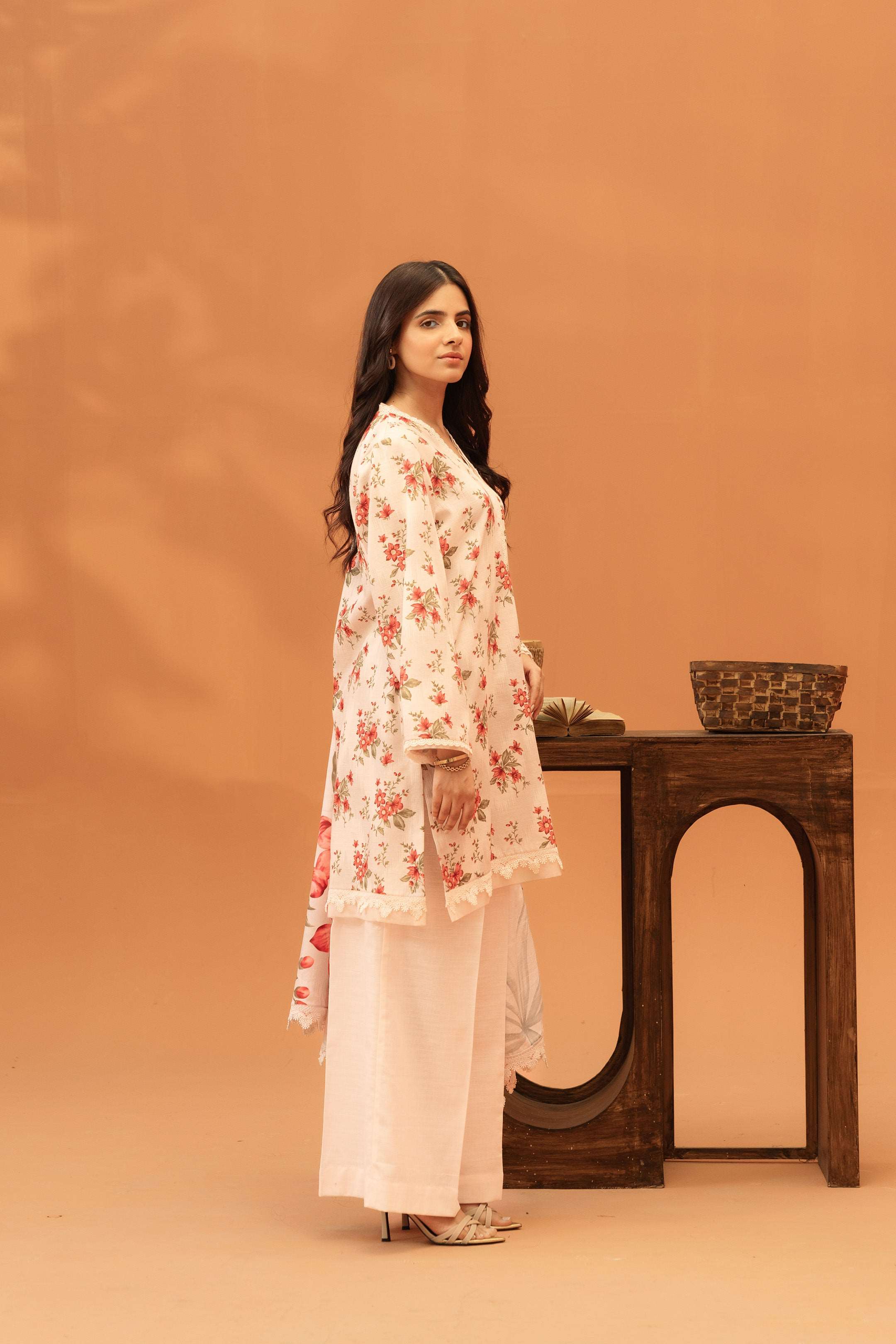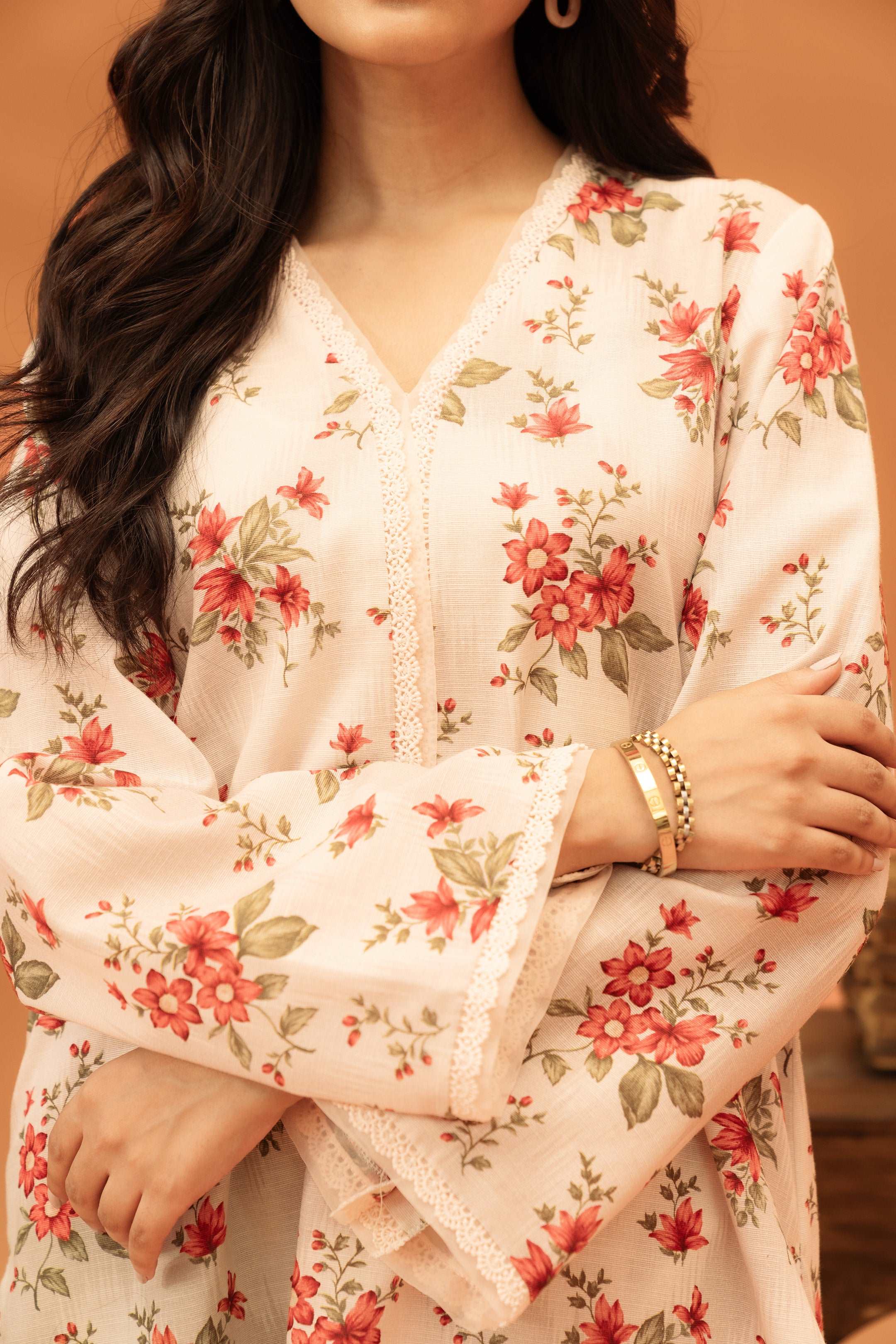 Bright florals on elegant off white khaddar Shirt giving it an airy and fresh look.